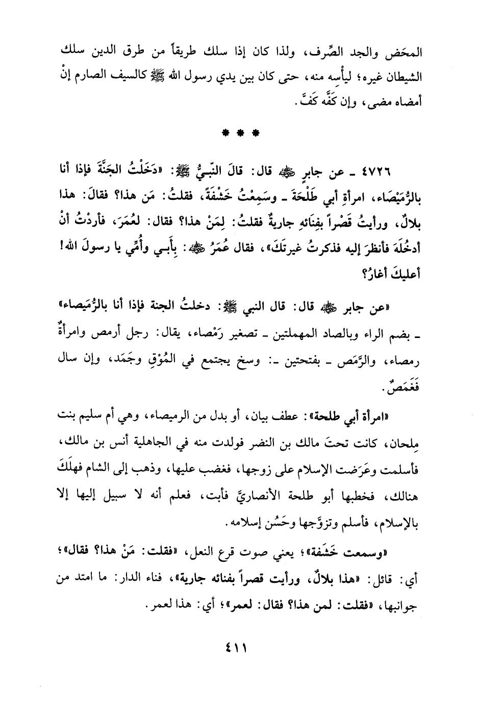 4726 - عن جابرٍ - رضي الله عنه - قال: قَالَ النّبيُّ - صلى الله عليه وسلم -: "دَخَلْتُ الجَنَّةَ فإذا أنا بالرُّمَيْصاء، امرأةِ أبي طَلْحَةَ - وسَمِعْتُ خَشْفَةً، فقلتُ: مَن هذا؛ فقالَ: هذا بلالٌ، ورأيتُ قَصراً بفِنائهِ جاريةٌ فقلتُ: لِمَنْ هذا؟ فقال: لعُمَرَ، فأردْتُ أنْ أدخُلَهَ فأنظرَ إليه فذكرتُ غيرتَكَ"، فقال عُمَرُ - رضي الله عنه -: بِأَبي وأُمِّي يا رسولَ الله! أعليكَ أغارُ؟