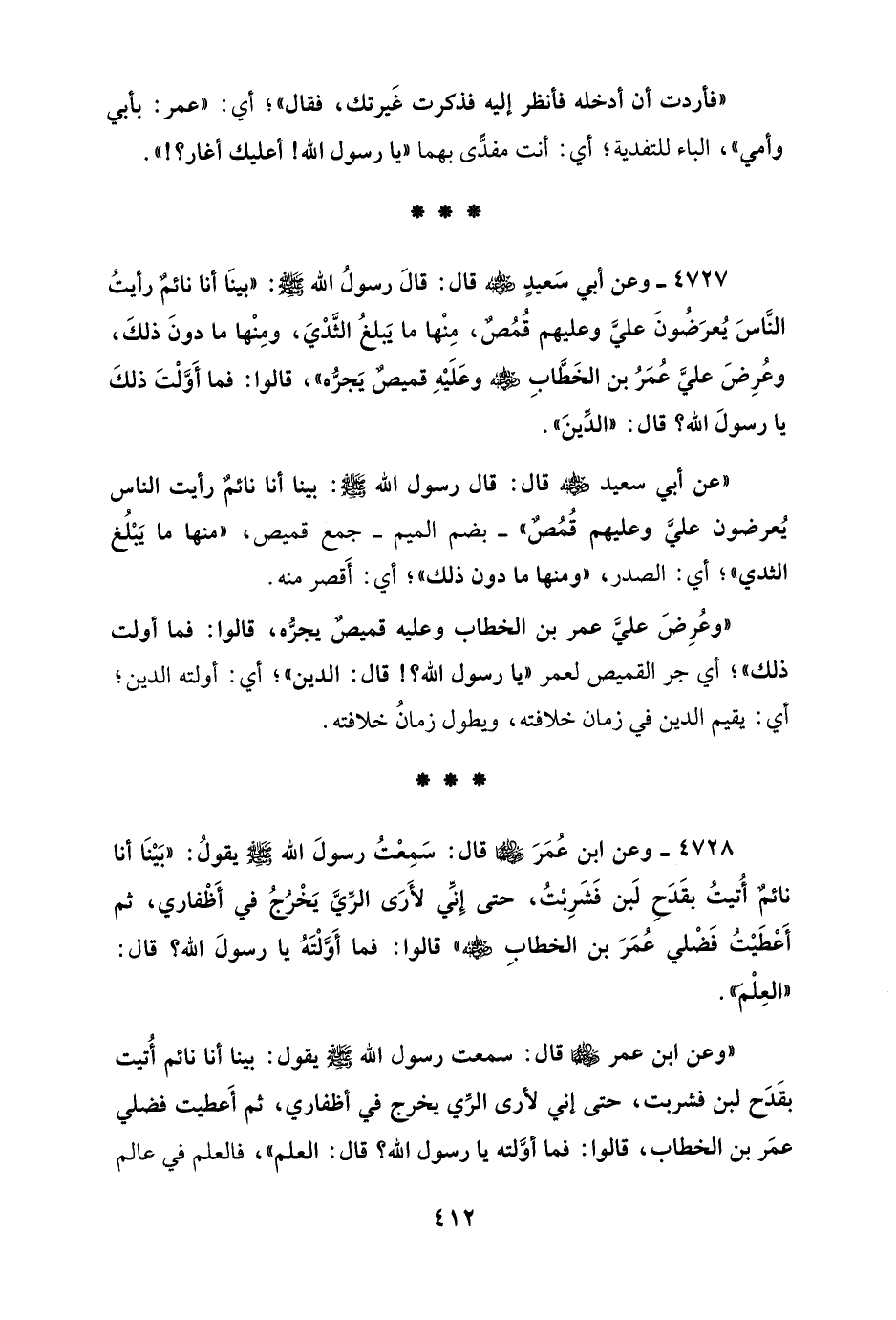 4728 - وعن ابن عُمَرَ قال: سَمِعْتُ رسولَ الله - صلى الله عليه وسلم - يقولُ: "بَيْنا أنا نائمٌ أُتيتُ بقَدَحِ لَبن فَشَرِبْتُ، حتى إِنِّي لأَرَى الرِّيَّ يَخْرُجُ في أَظْفاري، ثمَّ أَعْطَيْتُ فَضْلي عُمَرَ بن الخطابِ - رضي الله عنه - " قالوا: فما أَوَّلْتَهُ يا رسولَ الله؛ قال: "العِلْمَ".