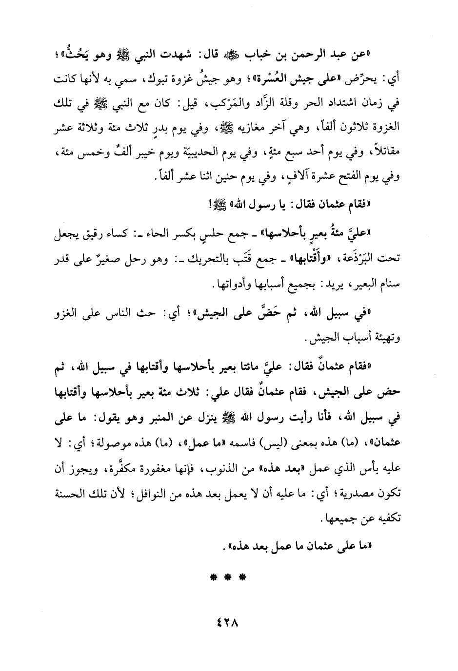 "فقام عثمانٌ فقال: عليَّ مائتا بعير بأحلاسها وأقتابها في سبيل الله، ثم حض على الجيش، فقام عثمانٌ فقال علي: ثلاث مئة بعير بأحلاسها وأقتابها في سبيل الله، فانا رأيت رسول الله - صلى الله عليه وسلم - ينزل عن المنبر وهو يقول: ما على عثمان"، (ما) هذه بمعنى (ليس) فاسمه "ما عمل"، (ما) هذه موصولة، أي: لا عليه بأس الذي عمل "بعد هذه" من الذنوب، فإنها مغفورة مكفَّرة، ويجوز أن تكون مصدرية؛ أي: ما عليه أن لا يعمل بعد هذه من النوافل؛ لأن تلك الحسنة تكفيه عن جميعها.