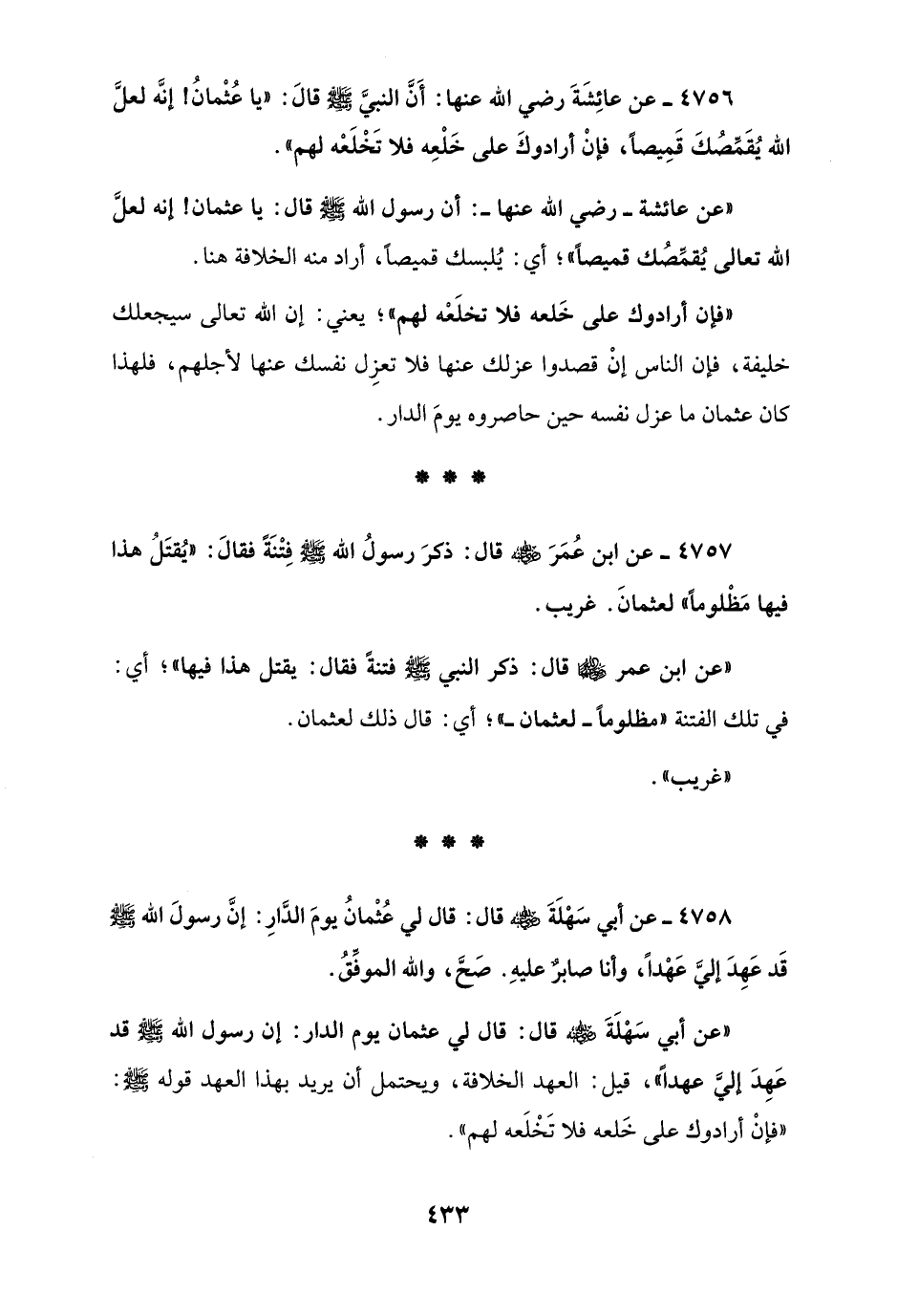 4756 - عن عائِشَةَ رضي الله عنها: أَنَّ النبيَّ - صلى الله عليه وسلم - قالَ: "يا عُثْمانُ! إنَّه لعلَّ الله يُقَمِّصُكَ قَمِيصًا، فإنْ أرادوكَ على خَلْعِه فلا تَخْلَعْه لهم".