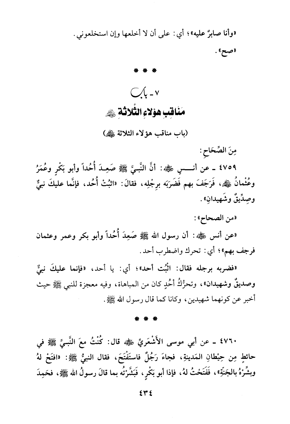 4759 - عن أنسٍ - رضي الله عنه -: أنَّ النَّبيَّ - صلى الله عليه وسلم - صَعِدَ أحُدًا وأبو بَكرٍ وعُمَرُ وعُثْمانُ - رضي الله عنهم -، فَرَجَفَ بهم فَضَرَبَه برِجْلِه، فقالَ: "اثبُتْ أُحُد، فإنَّما عليكَ نبيٌّ وصِدِّيقٌ وشَهيدانِ".