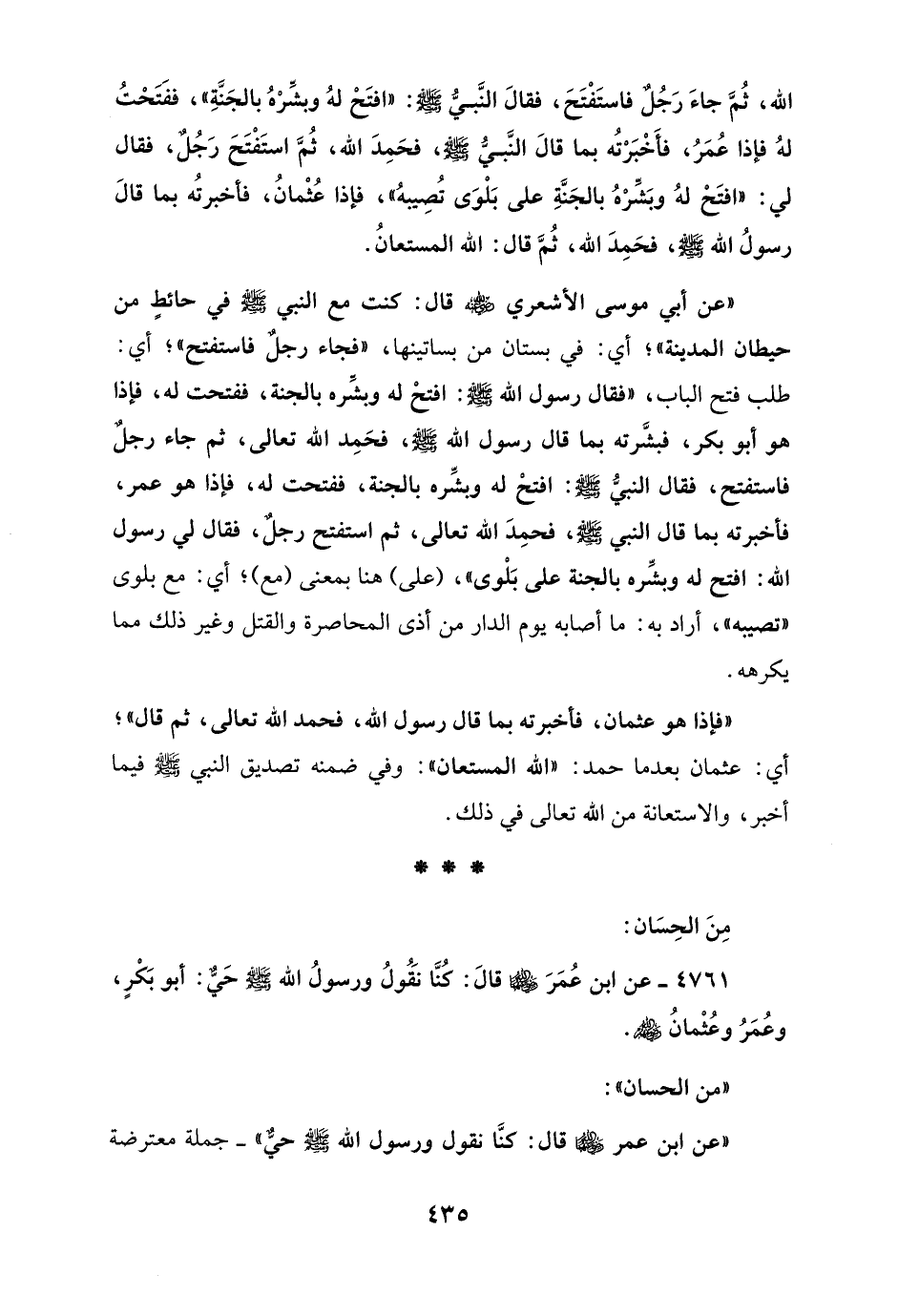 الله، ثُمَّ جاءَ رَجُلٌ فاستَفْتَحَ، فقالَ النَّبيّ - صلى الله عليه وسلم -: "افتَحْ لهُ وبشِّرْهُ بالجَنَّةِ"، ففَتَحْتُ لهُ فإذا عُمَرُ، فأَخْبَرْتُه بما قالَ النَّبيّ - صلى الله عليه وسلم -، فحَمِدَ الله، ثُمَّ استَفْتَحَ رَجُلٌ، فقال لي: "افتَحْ لهُ وبَشِّرْهُ بالجَنَّةِ على بَلْوَى تُصِيبهُ"، فإذا عُثْمانُ، فأخبرتُه بما قالَ رسولُ الله - صلى الله عليه وسلم -، فحَمِدَ الله، ثُمَّ قال: الله المستعانُ.