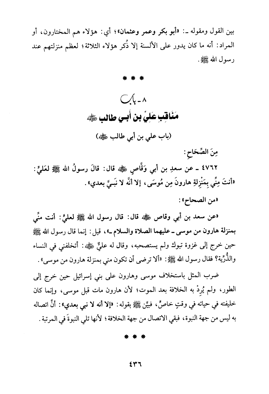 4762 - عن سعدِ بن أبي وَقَّاصٍ - رضي الله عنه - قال: قالَ رسولُ الله - صلى الله عليه وسلم - لعَليٍّ: "أنتَ مِنِّي بِمَنْزِلةِ هارونَ مِن مُوسَى، إلا أنَّه لا نبَيَّ بعدي".
