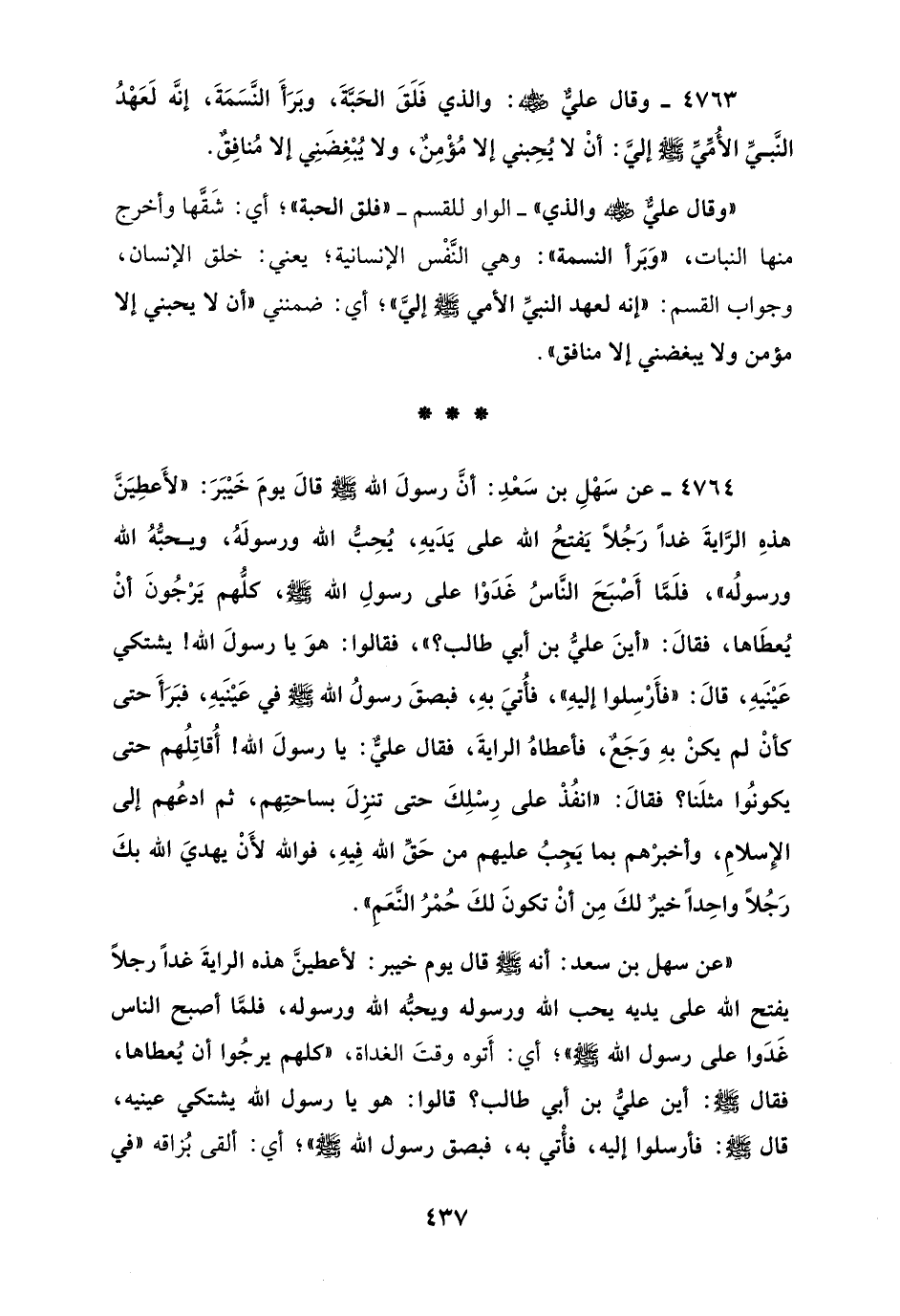 4764 - عن سَهْلِ بن سَعْدِ: أنَّ رسولَ الله - صلى الله عليه وسلم - قالَ يومَ خَيْبَرَ: "لأَعطِيَنَّ هذهِ الرَّايةَ غدًا رَجُلًا يَفتحُ الله على يَدَيهِ، يُحِبُّ الله ورسولَهُ، ويحبُّهُ الله ورسولُه"، فلَمَّا أَصْبَحَ النَّاسُ غَدَوْا على رسولِ الله - صلى الله عليه وسلم -، كلُّهم يَرْجُونَ أنْ يُعطَاها، فقالَ: "أينَ عليُّ بن أبي طالب؟ "، فقالوا: هوَ يا رسولَ الله! يشتكي عَيْنَيهِ، قالَ: "فأَرْسِلوا إليهِ"، فأُتيَ بهِ، فبصقَ رسولُ الله - صلى الله عليه وسلم - في عَيْنَيهِ، فبَرَأَ حتى كأنْ لم يكنْ بهِ وَجَعٌ، فأعطاهُ الرايةَ، فقال عليٌّ: يا رسولَ الله! أُقاتِلُهم حتى يكونُوا مثلَنا؟ فقالَ: "انفُذْ على رِسلِكَ حتى تنزِلَ بساحتِهم، ثم ادعُهم إلى الإِسلامِ، وأخبرْهم بما يَجبُ عليهم من حَقِّ الله فِيهِ، فوالله لأَنْ يهديَ الله بكَ رَجُلًا واحِدًا خيرٌ لكَ مِن أنْ تكونَ لكَ حُمْرُ النَّعَمِ".