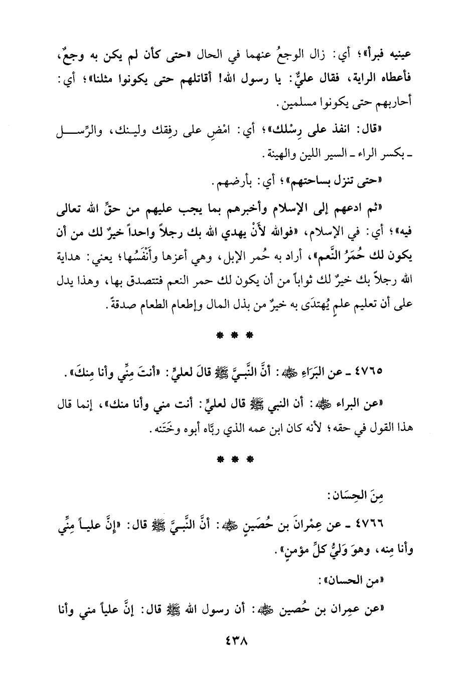 4766 - عن عِمْرانَ بن حُصَينٍ - رضي الله عنه -: أنَّ النَّبيَّ - صلى الله عليه وسلم - قال: "إِنَّ عليًّا مِنِّي وأنا مِنه، وهوَ وَليُّ كلِّ مؤمنٍ".