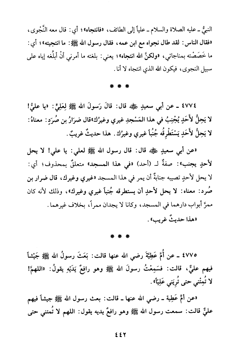 4774 - عن أبي سعيدٍ - رضي الله عنه - قال: قالَ رَسولَ الله - صلى الله عليه وسلم - لِعَلِيٍّ: "يا عليُّ! لا يَحِل لأَحَدٍ يُجْنِبُ في هذا المَسْجدِ غيري وغيرُك" قال ضرَارُ بن صُرَدٍ: معناهُ: لا يَحِلُّ لأَحَدٍ يَسْتَطْرِفُه جُنُبًا غيري وغيرُك. هذا حديثٌ غريبٌ.