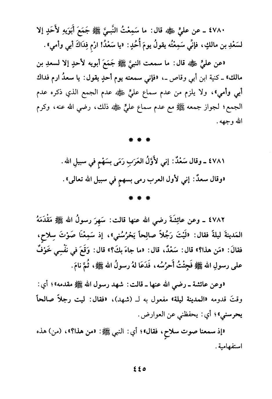4780 - عن عليٍّ - رضي الله عنه - قال: ما سَمِعْتُ النَّبيَّ - صلى الله عليه وسلم - جَمَعَ أَبَوَيهِ لأَحَدٍ إلا لسَعْدِ بن مالكٍ، فإنِّي سَمِعْتُه يقولُ يومَ أُحُدٍ: "يا سَعْدُ! ارْمِ فِدَاكَ أبي وأمي".