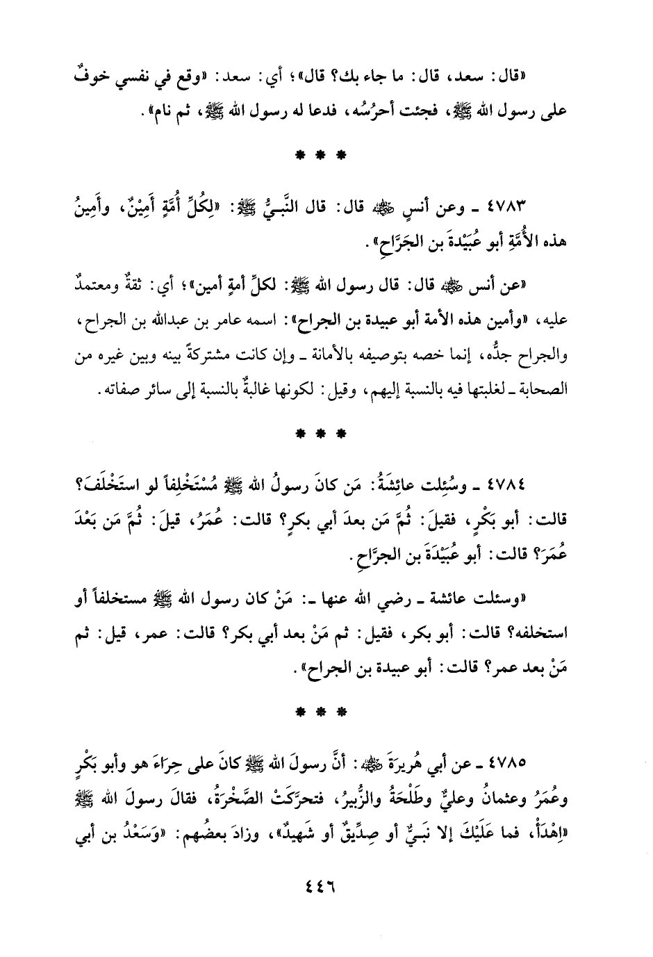 4784 - وسُئِلت عائِشَةُ: مَن كانَ رسولُ الله - صلى الله عليه وسلم - مُسْتَخْلِفًا لو استَخْلَفَ؟ قالت: أبو بَكرٍ، فقيل: ثُمَّ مَن بعدَ أبي بكرٍ؟ قالت: عُمَرُ، قيلَ: ثُمَّ مَن بَعْدَ عُمَر؟ قالت: أبو عُبَيْدَةَ بن الجرَّاحِ.