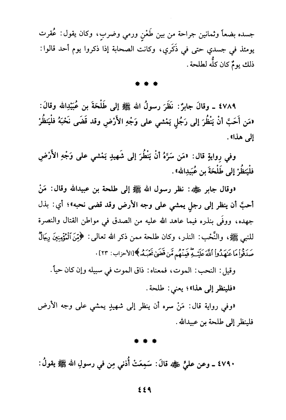 4789 - وقالَ جابرٌ: نَظَرَ رسولُ الله - صلى الله عليه وسلم - إلى طَلْحَةَ بن عُبَيْدِ الله وقالَ: "مَن أَحَبَّ أنْ يَنْظُرَ إلى رَجُلٍ يَمْشي على وَجْهِ الأَرْضِ وقد قَضَى نَحْبَهُ فلْيَنظُرْ إلى هذا".