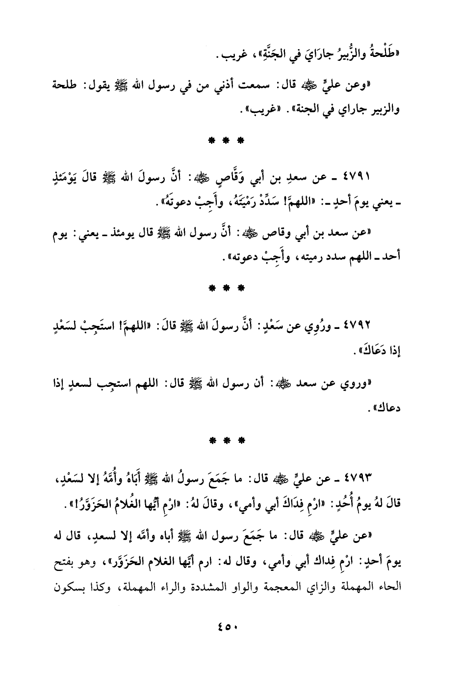 4792 - ورُوِي عن سَعْدٍ: أنَّ رسولَ الله - صلى الله عليه وسلم - قالَ: "اللهمَّ! استَجِبْ لسَعْدٍ إذا دَعَاكَ".