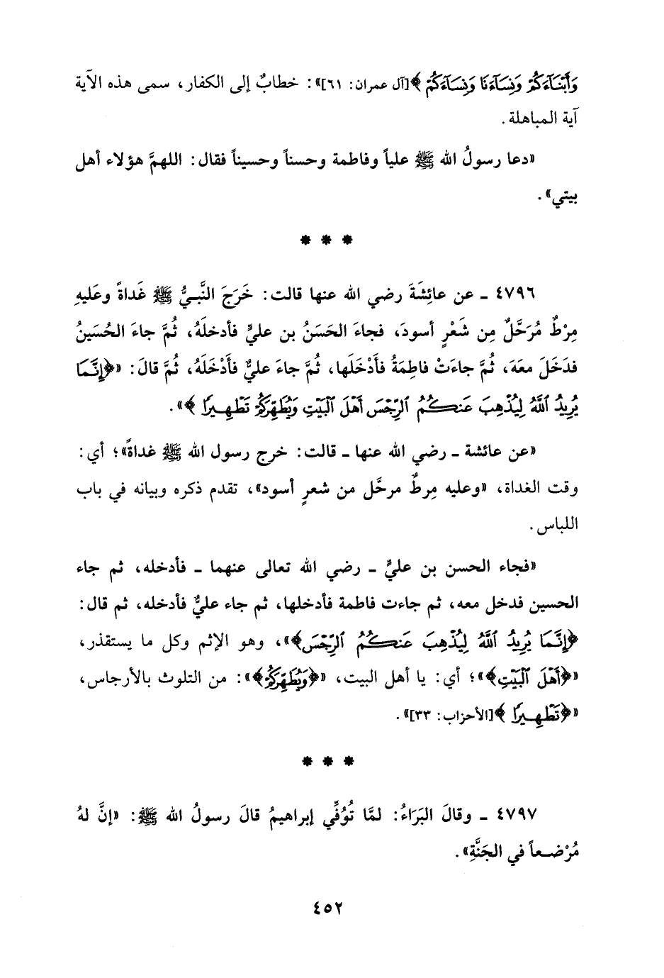 4796 - عن عائِشَةَ رضي الله عنها قالت: خَرَجَ النَّبيّ - صلى الله عليه وسلم - غَداةً وعَليهِ مِرْطٌ مُرَحَّل مِن شَعْرٍ أسودَ، فجاءَ الحَسَنُ بن عليٍّ فأدخلَهُ، ثُمَّ جاءَ الحُسَينُ فدَخَلَ معَهَ، ثُمَّ جاءَتْ فاطِمَةُ فأَدْخَلَها، ثُمَّ جاءَ عليٌّ فأَدْخَلَهُ، ثُمَّ قالَ: {إِنَّمَا يُرِيدُ اللَّهُ لِيُذْهِبَ عَنْكُمُ الرِّجْسَ أَهْلَ الْبَيْتِ وَيُطَهِّرَكُمْ تَطْهِيرًا} ".