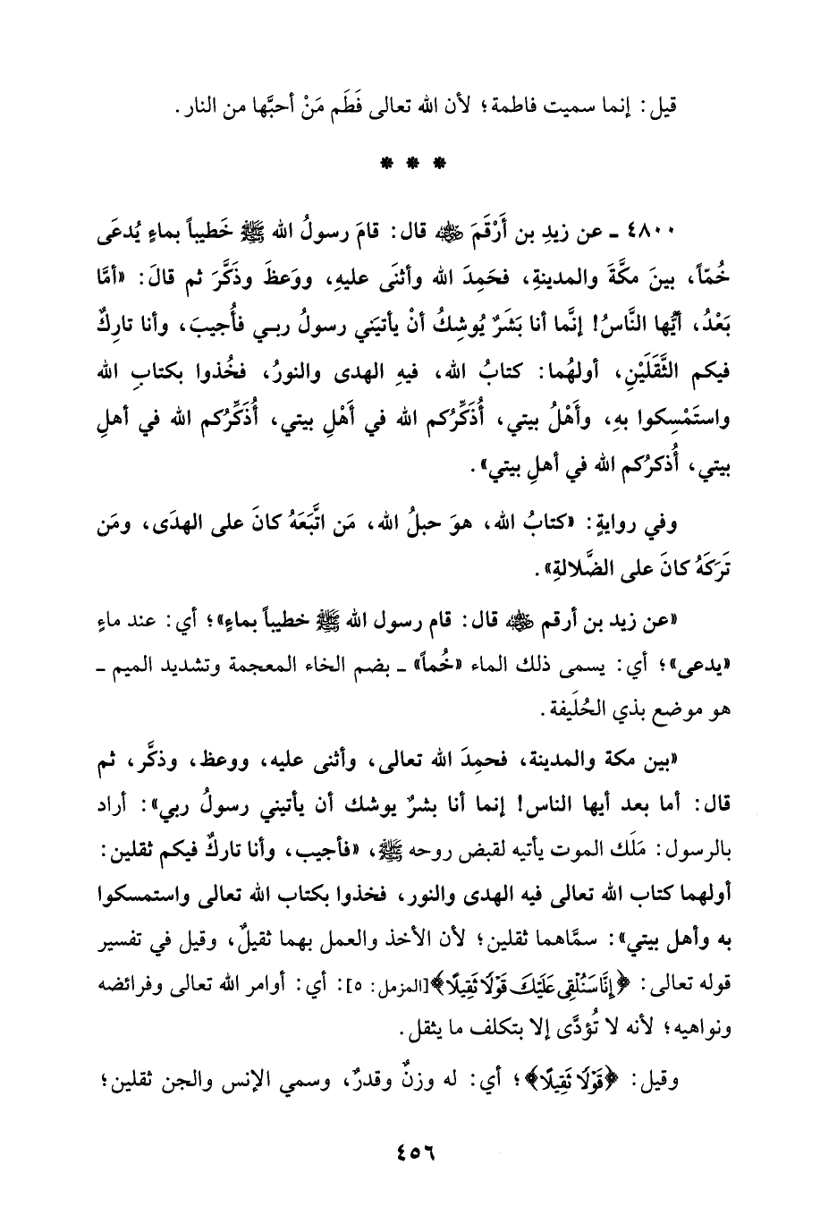 4800 - عن زيدِ بن أَرْقَمَ - رضي الله عنه - قال: قامَ رسولُ الله - صلى الله عليه وسلم - خَطيبًا بماءٍ يُدعَى خُمًّا، بينَ مكَّةَ والمدينةِ، فحَمِدَ الله وأثنَى عليهِ، ووَعظَ وذَكَّرَ ثم قالَ: "أمَّا بَعْدُ, أيُّها النَّاسُ! إنَّما أنا بَشَرٌ يُوشِكُ أنْ يأتيَني رسولُ ربي فأُجيبَ، وأنا تارِكٌ فيكم الثَّقَلَيْنِ، أولهُما: كتابُ الله، فيهِ الهدى والنورُ، فخُذوا بكتابِ الله واستَمْسِكوا بهِ، وأَهْلُ بيتي، أُذَكِّرُكم الله في أَهْلِ بيتي، أُذَكَرُكم الله في أهلِ بيتي، أُذكرُكم الله في أهلِ بيتي".