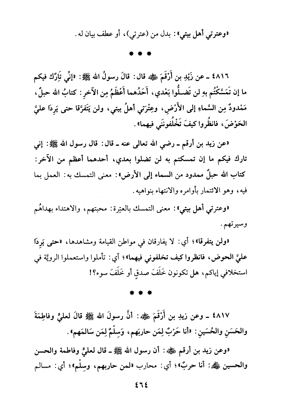 4816 - عن زَيْدِ بن أَرْقَمَ - رضي الله عنه - قال: قالَ رسولُ الله - صلى الله عليه وسلم -: "إنِّي تَاِركٌ فيكم ما إن تَمَسَّكْتُم بهِ لن تَضلُّوا بَعْدي، أَحَدُهما أَعْظَمُ مِن الآخرِ: كتابُ الله حبلٌ، مَمْدودٌ مِن السَّماءَ إلى الأَرْضِ، وعِتْرَتي أهلُ بيتي، ولن يَتَفرَّقا حتى يَرِدَا عليٍّ الحَوْضَ، فانظُروا كيفَ تَخْلُفوننَي فيهما".