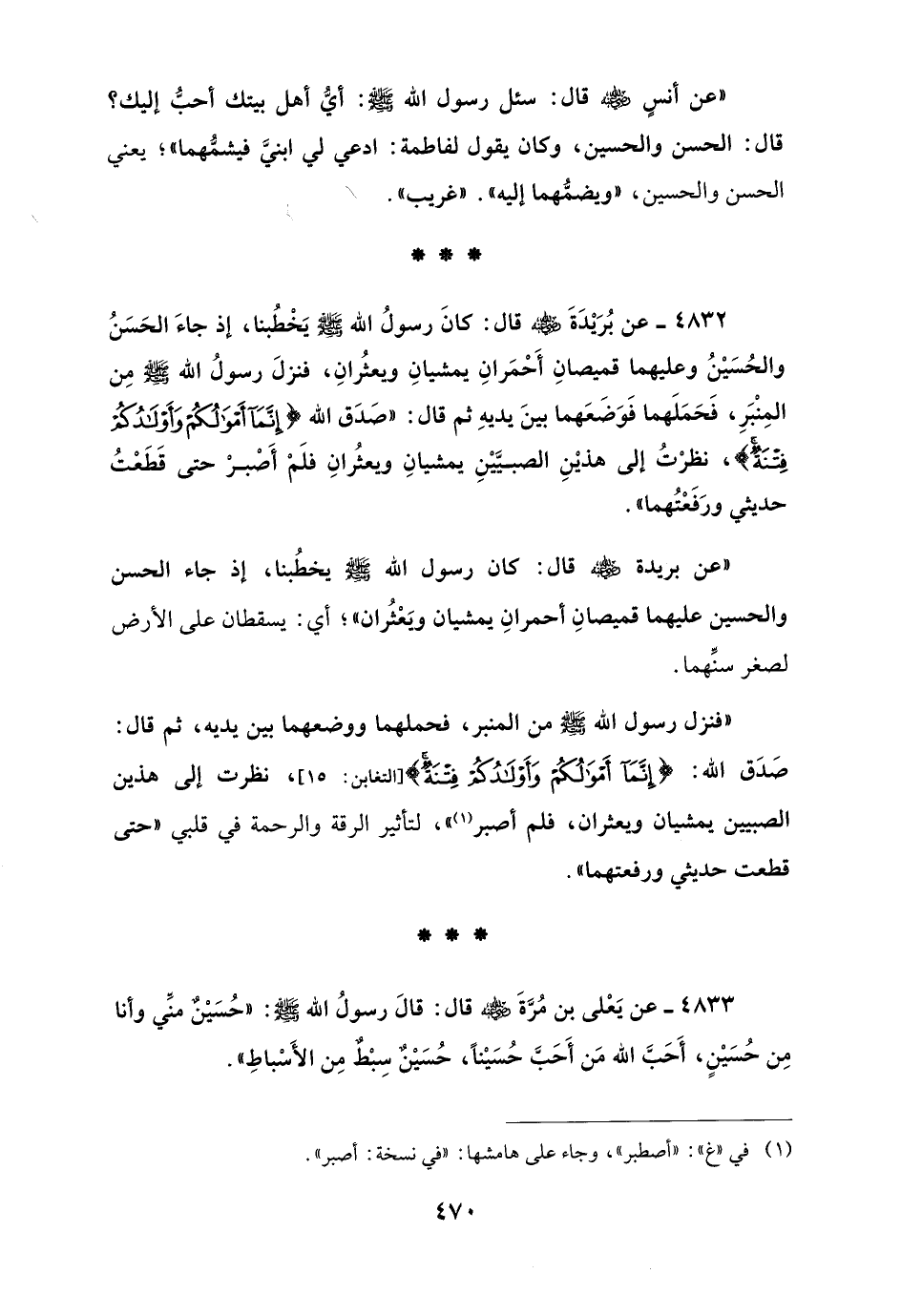 4832 - عن بُرَيْدَةَ - رضي الله عنه - قال: كانَ رسولُ الله - صلى الله عليه وسلم - يَخْطُبنا، إذ جاءَ الحَسَنُ والحُسَيْنُ وعليهما قميصانِ أَحْمَرانِ يمشيانِ ويعثُرانِ، فنزلَ رسولُ الله - صلى الله عليه وسلم - مِن المِنْبَرِ، فَحَمَلَهما فَوَضعَهما بينَ يديهِ ثم قال: "صَدَق الله {إَنَّمَا أَمْوَالُكُمْ وَأَوْلَادُكُمْ فِتْنَةٌ}، نظرْتُ إلى هذيْنِ الصبيَّيْنِ يمشيانِ ويعثُرانِ فلَمْ أَصْبرْ حتى قَطَعْتُ حديثي ورَفَعْتُهما".