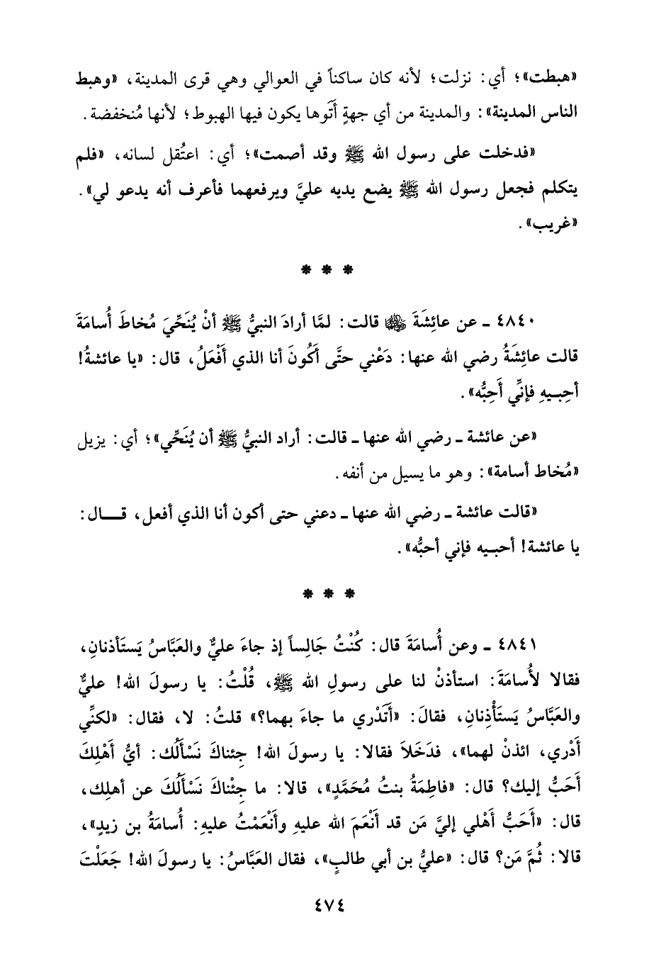 4841 - وعن أُسامَةَ قال: كنْتُ جَالِسًا إذ جاءَ عليٌّ والعَبَّاسُ يَستَأذنانِ، فقالا لأُسامَةَ: استأذنْ لنا على رسولِ الله - صلى الله عليه وسلم -، قُلْتُ: يا رسولَ الله! عليٌّ والعَبَّاسُ يَستَأْذِنانِ، فقالَ: "أَتَدْري ما جاءَ بهما؟ " قلتُ: لا، فقال: "لكنِّي أَدْري، ائذنْ لهما"، فدَخَلاَ فقالا: يا رسولَ الله! جِئناكَ نَسْألك: أيُّ أَهْلِكَ أَحَبُّ إليك؟ قال: "فاطِمَةُ بنتُ مُحَمَّدٍ"، قالا: ما جِئْناكَ نَسْأَلُكَ عن أهلِك، قال: "أَحَبُّ أَهْلي إليَّ مَن قد أَنْعَمَ الله عليهِ وأَنْعَمْتُ عليهِ: أُسامَةُ بن زيدٍ"، قالا: ثُمَّ مَن؟ قال: "عليُّ بن أبي طالبٍ"، فقال العَبَّاسُ: يا رسولَ الله! جَعَلْتَ