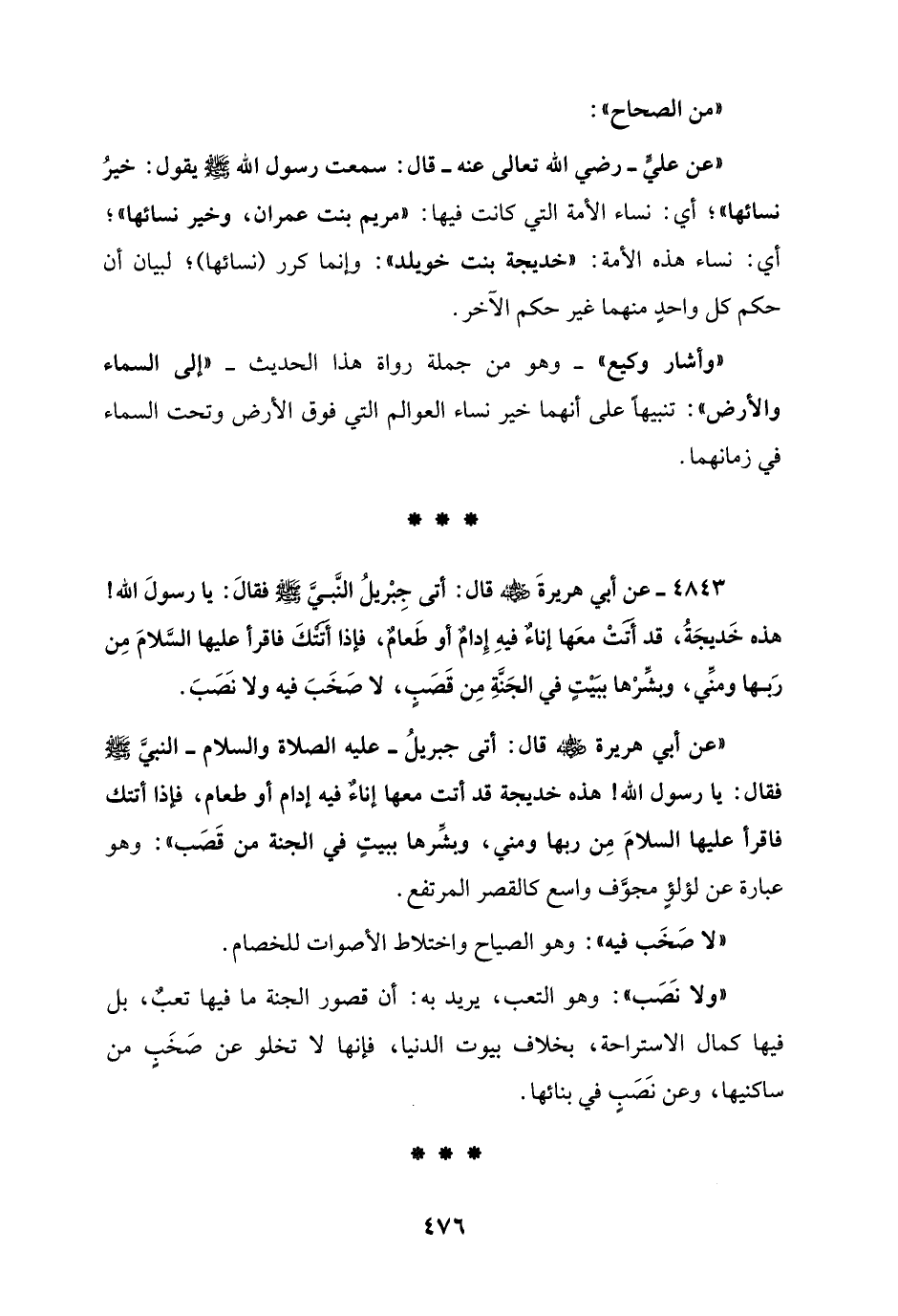4843 - عن أبي هريرةَ - رضي الله عنه - قال: أتى جِبْريلُ النَّبيَّ - صلى الله عليه وسلم - فقالَ: يا رسولَ الله! هذه خَديجَةُ، قد أَتَتْ معَها إناءٌ فيهِ إِدامٌ أو طَعامٌ، فإذا أَتَتْكَ فاقرأ عليها السَّلامَ مِن رَبها ومنِّي، وبشِّرْها ببَيْتٍ في الجَنَّةِ مِن قَصَبٍ، لا صَخَبَ فيه ولا نَصَبَ.