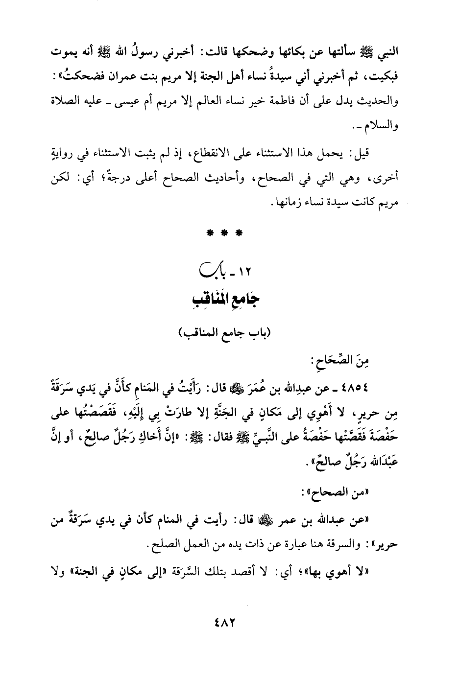 4854 - عن عبدِ الله بن عُمَرَ - رضي الله عنهما - قال: رَأَيْتُ في المَنامِ كأَنَّ في يَدي سَرَقَةً مِن حريرٍ، لا أَهْوِي إلى مَكانٍ في الجَنَّةِ إلا طارَتْ بِي إِلَيْهِ، فَقَصَصْتُها على حَفْصَةَ فَقَصَّتْها حَفْصَةُ على النَّبيِّ - صلى الله عليه وسلم - فقال: - صلى الله عليه وسلم -: "إنَّ أَخاكِ رَجُلٌ صالِحٌ، أو إنَّ عَبْدَ الله رَجُلٌ صالحٌ".