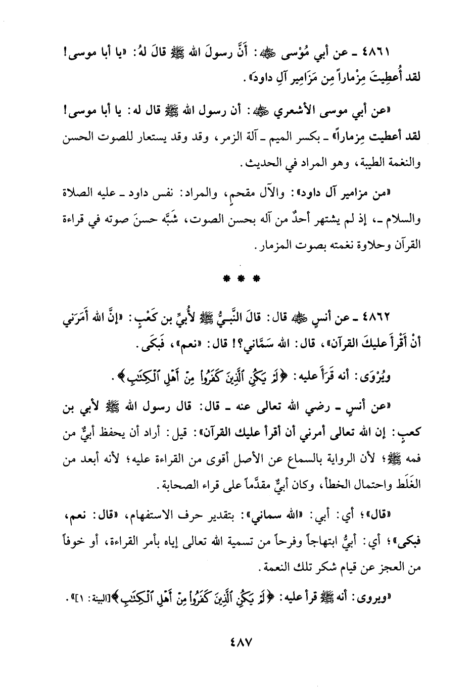 4861 - عن أبي مُوْسى - رضي الله عنه -: أَنَّ رسولَ الله - صلى الله عليه وسلم - قالَ لهُ: "يا أبا موسى! لقد أُعطِيتَ مِزْمارًا مِن مَزَامِير آلِ داودَ".