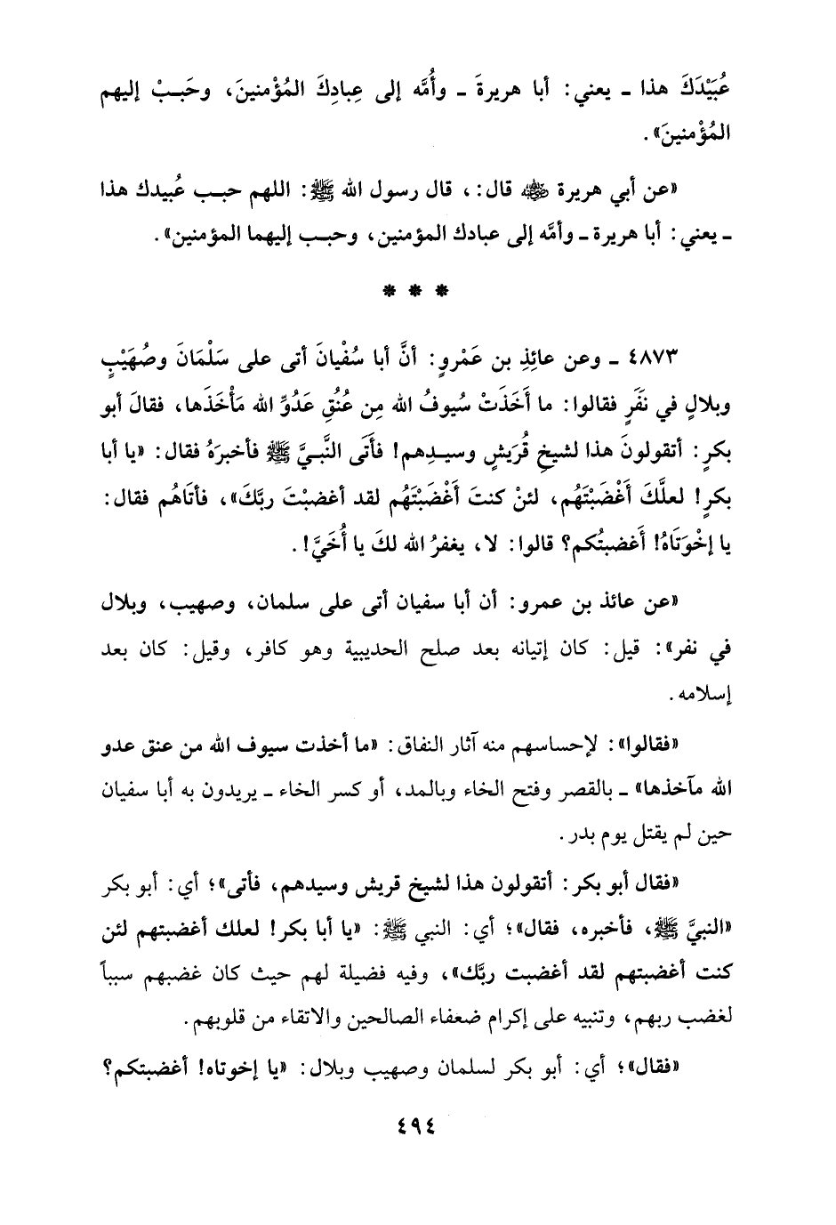 4873 - وعن عائِذِ بن عَمْروٍ: أن أبا سُفْيانَ أتى على سَلْمَانَ وصُهَيْبٍ وبلالٍ في نَفَرٍ فقالوا: ما أَخَذَتْ سُيوفُ الله مِن عُنُقِ عَدُوِّ الله مَأْخَذَها، فقالَ أبو بكرٍ: أتقولونَ هذا لشيخ قُرَيشٍ وسيدِهم! فأَتَى النَّبيَّ - صلى الله عليه وسلم - فأخبرَهُ فقال: "يا أبا بكرٍ! لعلَّكَ أَغْضَبْتَهُم، لئنْ كنتَ أَغْضَبْتَهُم لقد أغْضبْتَ ربَّكَ"، فأتَاهُم فقال: يا إخْوَتَاهُ! أَغضبتكم؟ قالوا: لا، يغفرُ الله لكَ يا أُخَيَّ!.