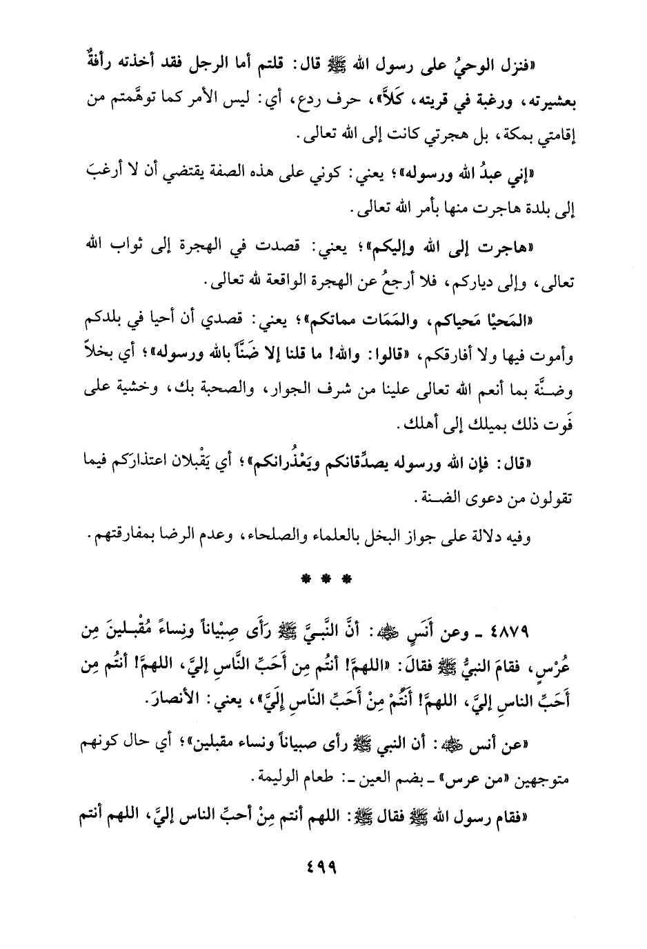 4879 - وعن أَنَسٍ - رضي الله عنه -: أن النَّبيَّ - صلى الله عليه وسلم - رَأَى صِبْيانًا ونِساءً مُقْبلينَ مِن عُرْسٍ، فقامَ النبيُّ - صلى الله عليه وسلم - فقالَ: "اللهمَّ! أنتُم مِن أَحَبِّ النَّاسِ إليَّ، اللهمَّ! أنتُم مِن أَحَبِّ الناسِ إليَّ، اللهمَّ! أَنْتُمْ مِنْ أَحَبِّ النّاسِ إِلَيَّ"، يعني: الأنصارَ.