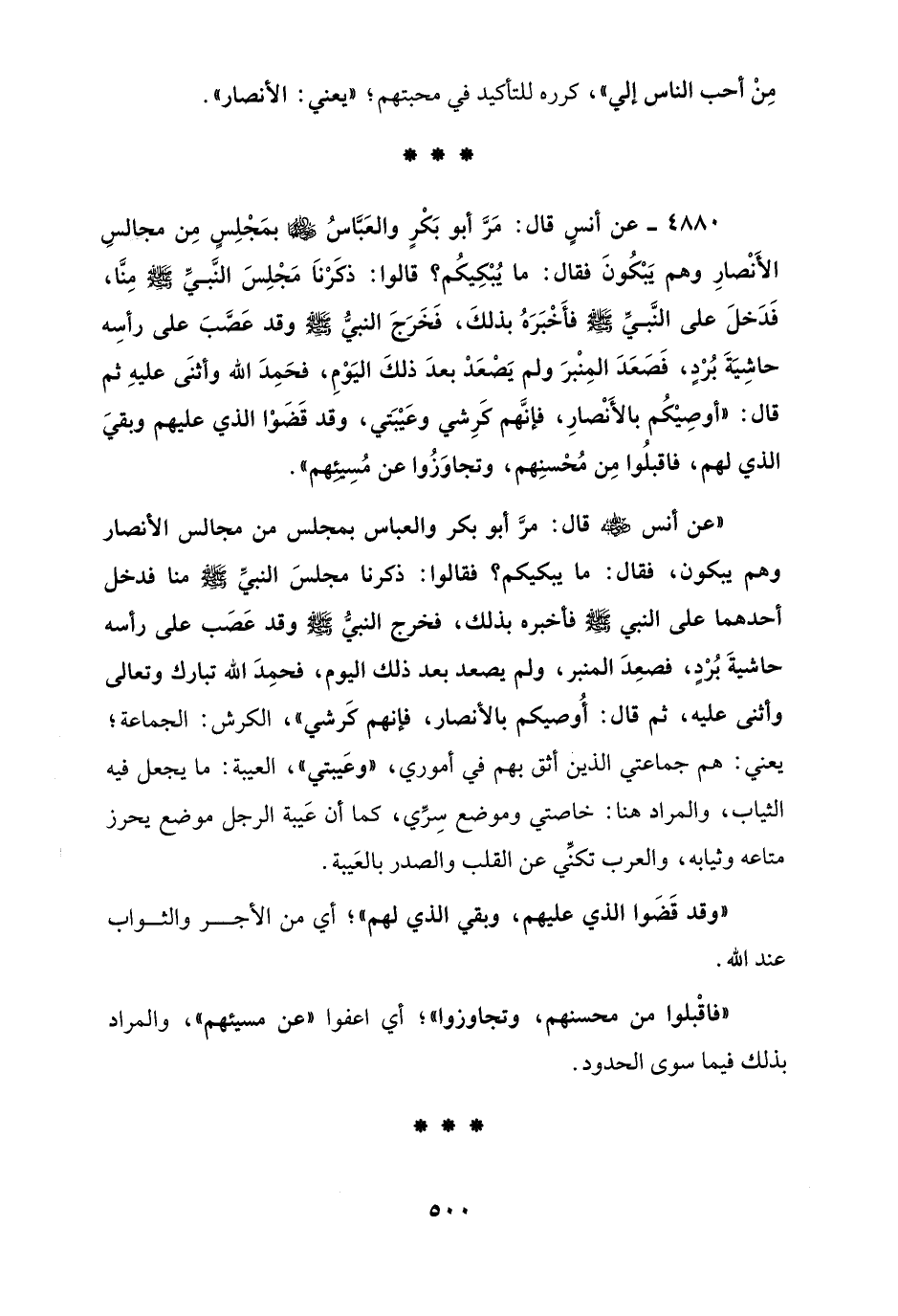 4880 - عن أنسٍ قال: مَرَّ أبو بَكْرٍ والعَبَّاسُ - رضي الله عنهما - بمَجْلِسٍ مِن مجالسِ الأَنْصارِ وهم يَبْكُونَ فقال: ما يُبْكِيكُم؟ قالوا: ذكَرْنَا مَجْلِسَ النَّبيِّ - صلى الله عليه وسلم - مِنَّا، فَدَخلَ على النَّبيِّ - صلى الله عليه وسلم - فأَخْبَرَهُ بذلكَ، فَخَرَجَ النبيُّ - صلى الله عليه وسلم - وقد عَصَّبَ على رأسه حاشِيَةَ بُرْدٍ، فَصَعَدَ المِنْبرَ ولم يَصْعَدْ بعدَ ذلكَ اليَوْمِ، فحَمِدَ الله وأثنَى عليهِ ثم قال: "أوصِيْكُم بالأَنْصارِ، فإنَّهم كَرِشي وعَيْبَتي، وقد قَضَوْا الذي عليهم وبقيَ الذي لهم، فاقبلُوا مِن مُحْسنِهم، وتجاوَزُوا عن مُسِيئهم".