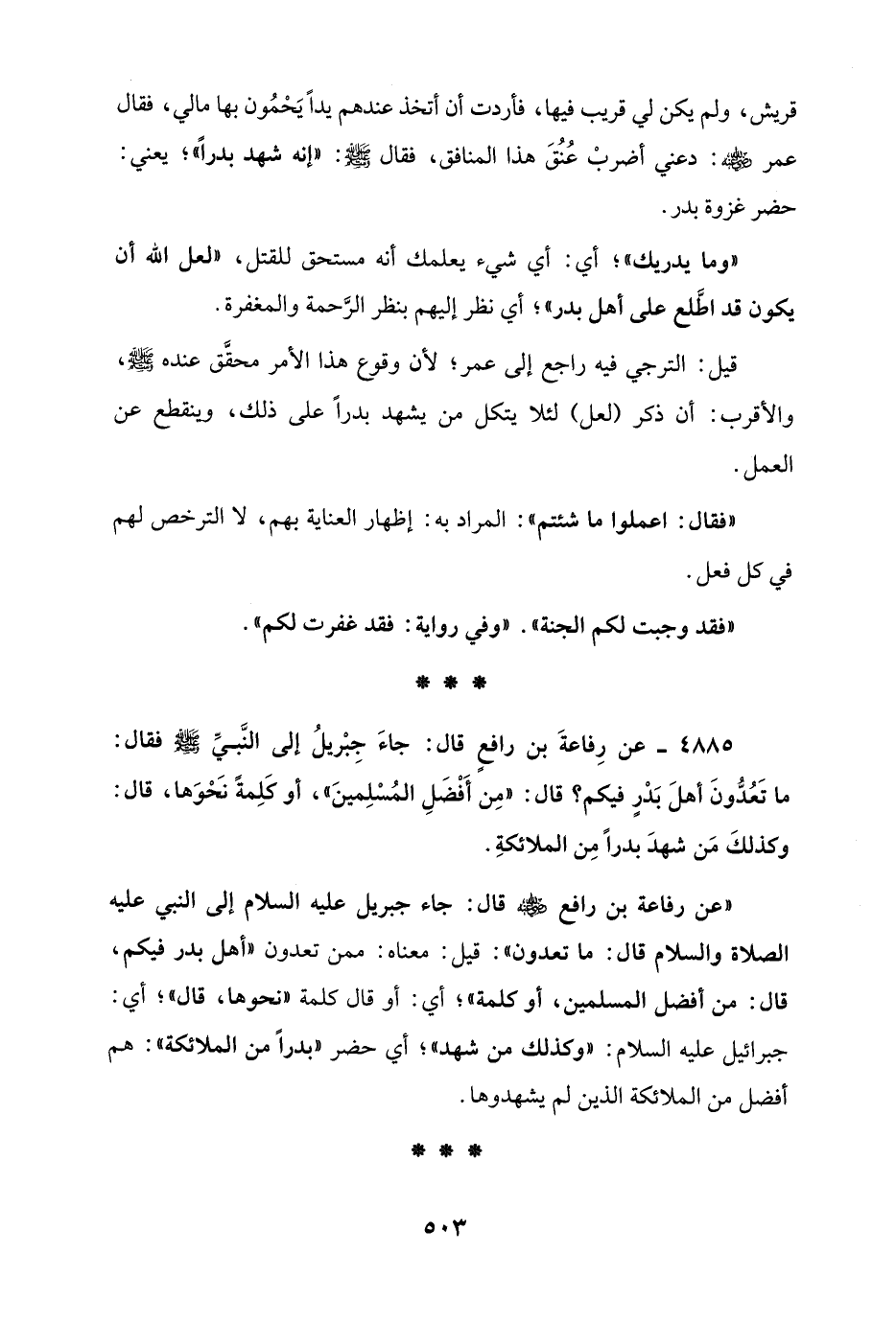 4885 - عن رِفاعةَ بن رافعٍ قال: جاءَ جِبْريلُ إلى النَّبيِّ - صلى الله عليه وسلم - فقال: ما تَعُدُّونَ أهلَ بَدْرٍ فيكم؟ قال: "مِن أَفْضَلِ المُسْلِمينَ"، أو كَلِمةً نحوَها، قال: وكذلكَ مَن شهدَ بدرًا مِن الملائكةِ.