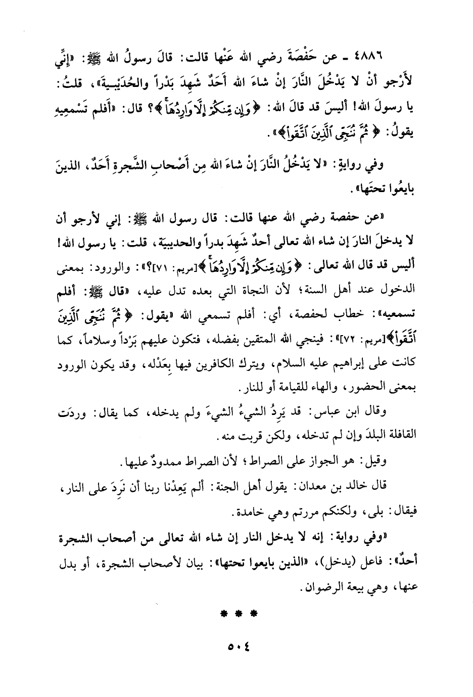 "عن حفصة رضي الله عنها قالت: قال رسول الله - صلى الله عليه وسلم -: إني لأرجو أن لا يدخلَ النارَ إن شاء الله تعالى أحدٌ شَهِدَ بدرًا والحديبيَة، قلت: يا رسول الله! أليس قد قال الله تعالى: {وَإِنْ مِنْكُمْ إِلَّا وَارِدُهَا} [مريم: 71]؟ ": والورود: بمعنى الدخول عند أهل السنة؛ لأن النجاة التي بعده تدل عليه، "قال - صلى الله عليه وسلم -: أفلم تسمعيه": خطاب لحفصة، أي: أفلم تسمعي الله "يقول: {ثُمَّ نُنَجِّي الَّذِينَ اتَّقَوْا} [مريم: 72] ": فينجي الله المتقين بفضله، فتكون عليهم بَرْدًا وسلامًا، كما كانت على إبراهيم عليه السلام، ويترك الكافرين فيها بِعَدْله، وقد يكون الورود بمعنى الحضور، والهاء للقيامة أو للنار.