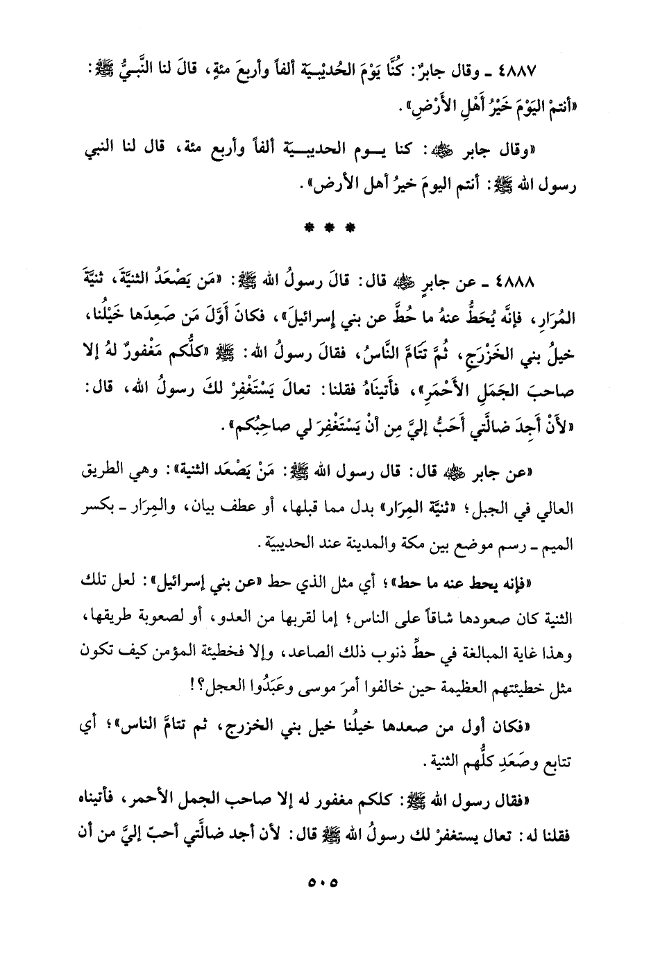 4888 - عن جابرٍ - رضي الله عنه - قال: قالَ رسولُ الله - صلى الله عليه وسلم -: "مَن يَصْعَدُ الثنيَّةَ، ثنيَّةَ المُرَارِ، فإنَّه يُحَطُّ عنهُ ما حُطَّ عن بني إِسرائيلَ"، فكانَ أَوَّلَ مَن صَعِدَها خَيْلُنا، خيلُ بني الخَزْرجَ، ثُمَّ تتَامَّ النَّاسُ، فقالَ رسولُ الله: - صلى الله عليه وسلم - "كلُّكم مَغْفورٌ لهُ إلا صاحبَ الجَمَلِ الأَحْمَرِ"، فأَتينَاهُ فقلنا: تعالَ يَسْتَغْفِرْ لكَ رسولُ الله، قال: "لأَنْ أَجدَ ضالَّتي أَحَبُّ إليَّ مِن أنْ يَسْتَغْفِرَ لي صاحِبُكم".