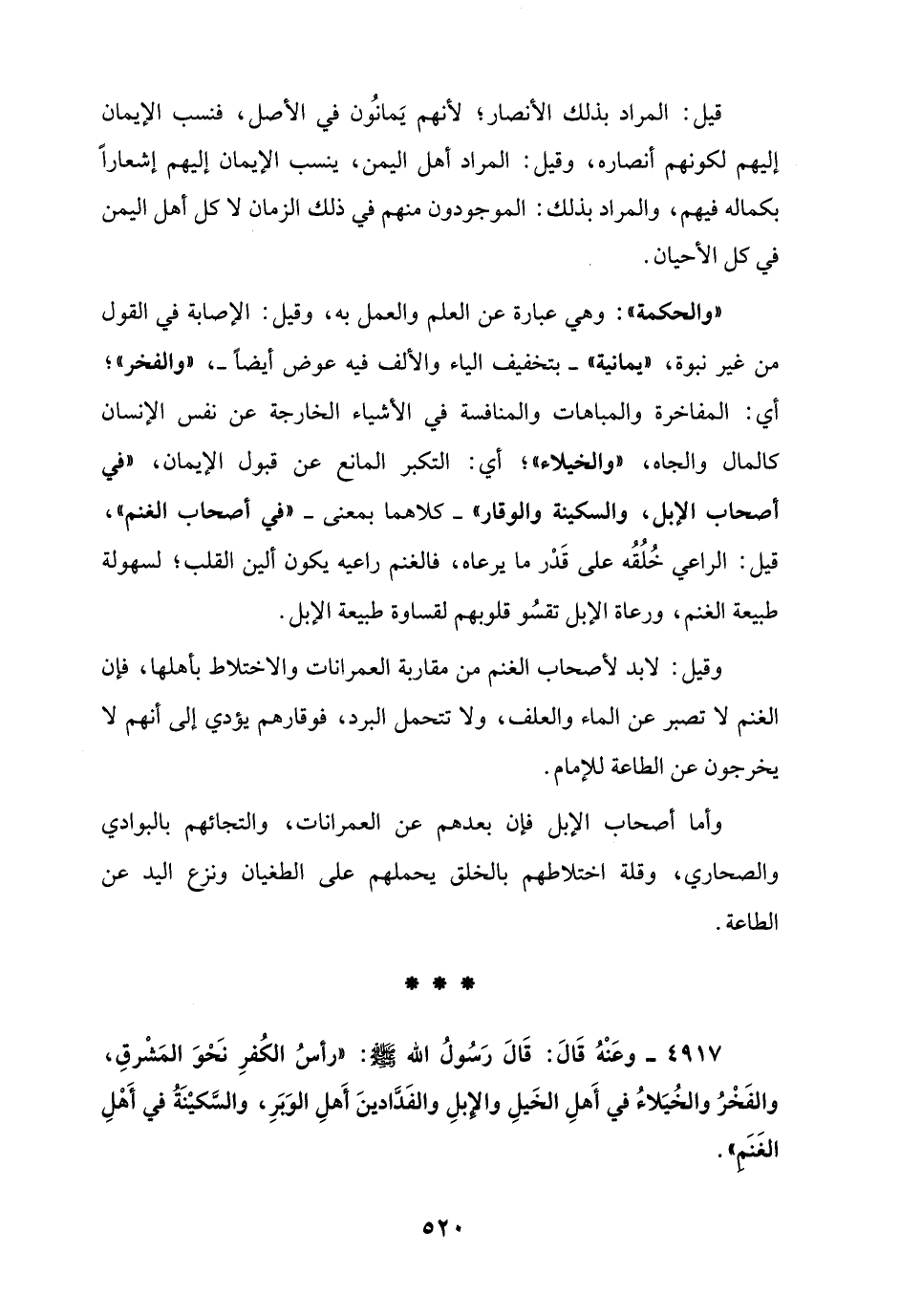 4917 - وعَنْة قَالَ: قَالَ رَسُولُ الله - صلى الله عليه وسلم -: "رأسُ الكُفرِ نَحْوَ المَشْرقِ، والفَخْرُ والخُيَلاءُ في أَهلِ الخَيلِ والإِبلِ والفَدَّادينَ أَهلِ الوَبَرِ، والسَّكيْنَةُ في أَهْلِ الغَنَمِ".