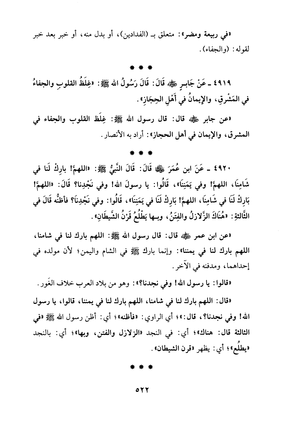 4920 - عَنَ ابن عُمَرَ - رضي الله عنهما - قَالَ: قَالَ النَّبيُّ - صلى الله عليه وسلم -: "اللهمَّ! بارِكْ لَنا في شَامِنَا، اللهمَّ! وفي يَمَنِنَا"، قَالُوا: يا رسولَ الله! وفي نَجْدِنا؛ قَالَ: "اللهمَّ! بَارِكْ لَنَا في شَامِنَا، اللهمَّ! بَارِكْ لَنَا في يَمَنِنَا"، قَالُوا: وفي نَجْدِنَا؛ فأظنُّه قَالَ في الثَّالثةِ: "هُنَاكَ الزَّلازلُ والفِتَنُ، وبها يَطْلُعُ قَرْنُ الشَّيطَانِ".