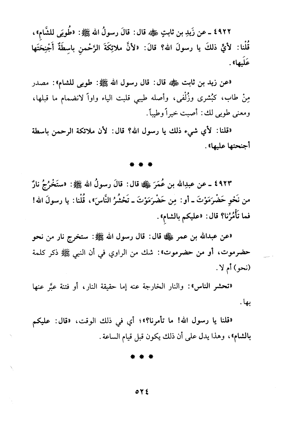 4922 - عن زَيدِ بن ثابتٍ - رضي الله عنه - قال: قالَ رسولُ الله - صلى الله عليه وسلم -: "طُوبَى للشَّامِ"، قُلْنا: لأيٍّ ذلكَ يا رسولَ الله؟ قالَ: "لأنَّ ملائِكَةَ الرَّحْمنِ باسِطَةٌ أَجْنِحَتَها عَلَيها".