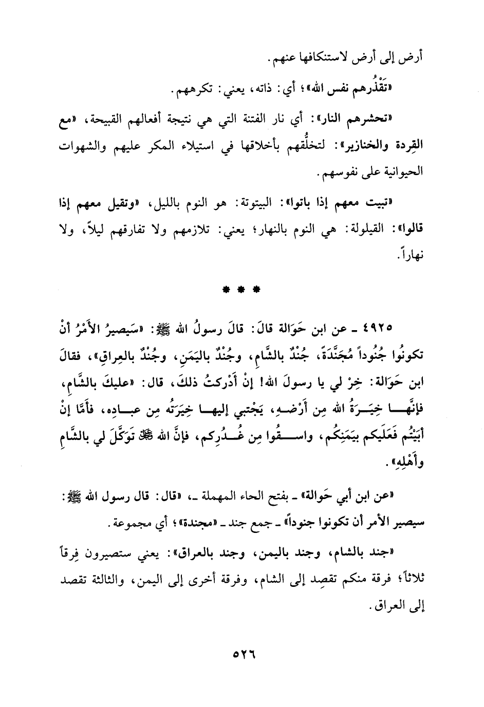 4925 - عن ابن حَوَالة قالَ: قالَ رسولُ الله - صلى الله عليه وسلم -: "سَيصيرُ الأَمْرُ أنْ تكونُوا جُنُودًا مُجَنَّدَةً، جُنْدٌ بالشَّامِ، وجُنْدٌ باليَمَنِ، وجُنْدٌ بالعِراقِ"، فقالَ ابن حَوَالة: خِرْ لي يا رسولَ الله! إنْ أَدْركتُ ذلكَ، قال: "عليكَ بالشَّامِ، فإنَّها خِيَرَةُ الله مِن أَرْضهِ، يَجْتبي إليها خِيَرَتُه مِن عبادِه، فأَمَّا إنْ أبَيْتُم فَعَلَيكم بيَمَنِكُم، واسقُوا مِن غُدُرِكم، فإنَّ الله عز وجل تَوَكَّلَ لي بالشَّامِ وأهلِهِ".