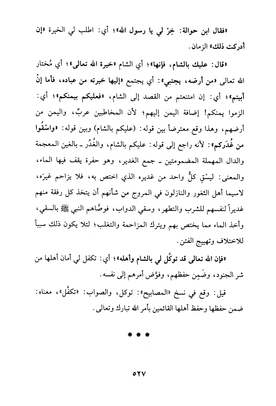 "قال: عليك بالشام، فإنها"؛ أي الشام "خيرة الله تعالى"، أي مُختار الله تعالى "من أرضه، يجتبي": أي يجتمع "إليها خيرته من عباده، فأما إنْ أبيتم"؛ أي: إن امتنعتم من القصد إلى الشام، "فعليكم بيمنكم"، أي: الزموا يمنكم! إضافة اليمن إليهم؛ لأن المخاطبين عربٌّ، واليمن من أرضهم، وهذا وقع معترضًا بين قوله: (عليكم بالشام) وبين قوله: "واسْقُوا من غُدَركم": لأنه راجع إلى قوله: عليكم بالشام، والغُدُر - بالغين المعجمة والدال المهملة المضمومتين - جمع الغدير، وهو حفرة يقف فيها الماء، والمعنى: ليسْقِ كلُّ واحد من غديره الذي اختص به، فلا يزاحم غيرَه، لاسيما أهل الثغور والنازلون في المروج من شأنهم أن يتخذ كل رفقة منهم غديرًا لنفسهم للشرب والتطهر، وسقي الدواب، فوصَّاهم النبي - صلى الله عليه وسلم - بالسقي، وأخذ الماء مما يختص بهم ويترك المزاحمة والتغلب؛ لئلا يكون ذلك سببًا للاختلاف وتهييج الفتن.