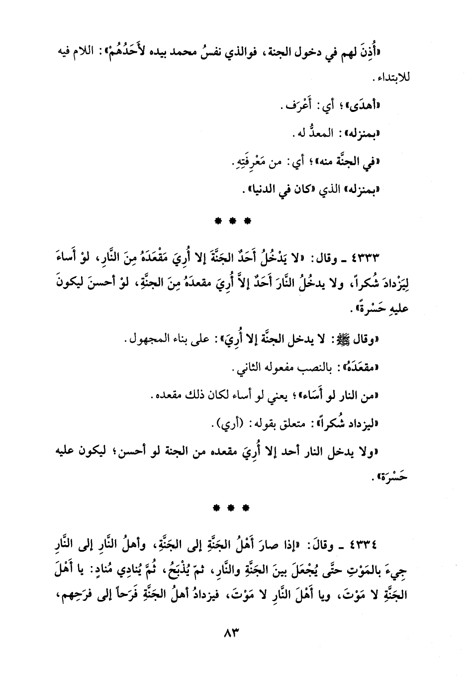 4333 - وقال: " لا يَدْخُلُ أَحَدٌ الجَنَّةَ إلا أُرِيَ مَقْعَدَهُ مِنَ النَّارِ، لوْ أَساءَ لِيَزْدادَ شُكرًا، ولا يدخُلُ النَّارَ أَحَدٌ إلَّا أُرِيَ مقعدَهُ مِنَ الجنَّةِ، لوْ أحسنَ ليكونَ عليهِ حَسْرةً ".