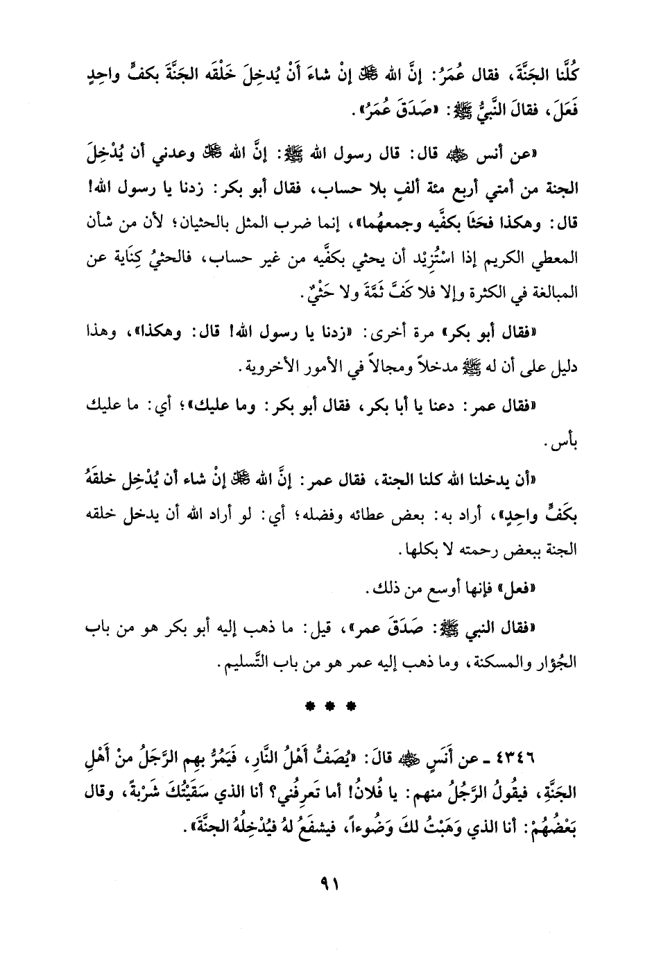 " أن يدخلنا الله كلنا الجنّة، فقال عمر: إنَّ الله - عَزَّ وَجَلَّ - إنْ شاء أن يُدْخِل خلقَهُ بكَفٍّ واحِدٍ "، أراد به: بعض عطائه وفضله؛ أي: لو أراد الله أن يدخل خلقه الجنّة ببعض رحمته لا بكلها.