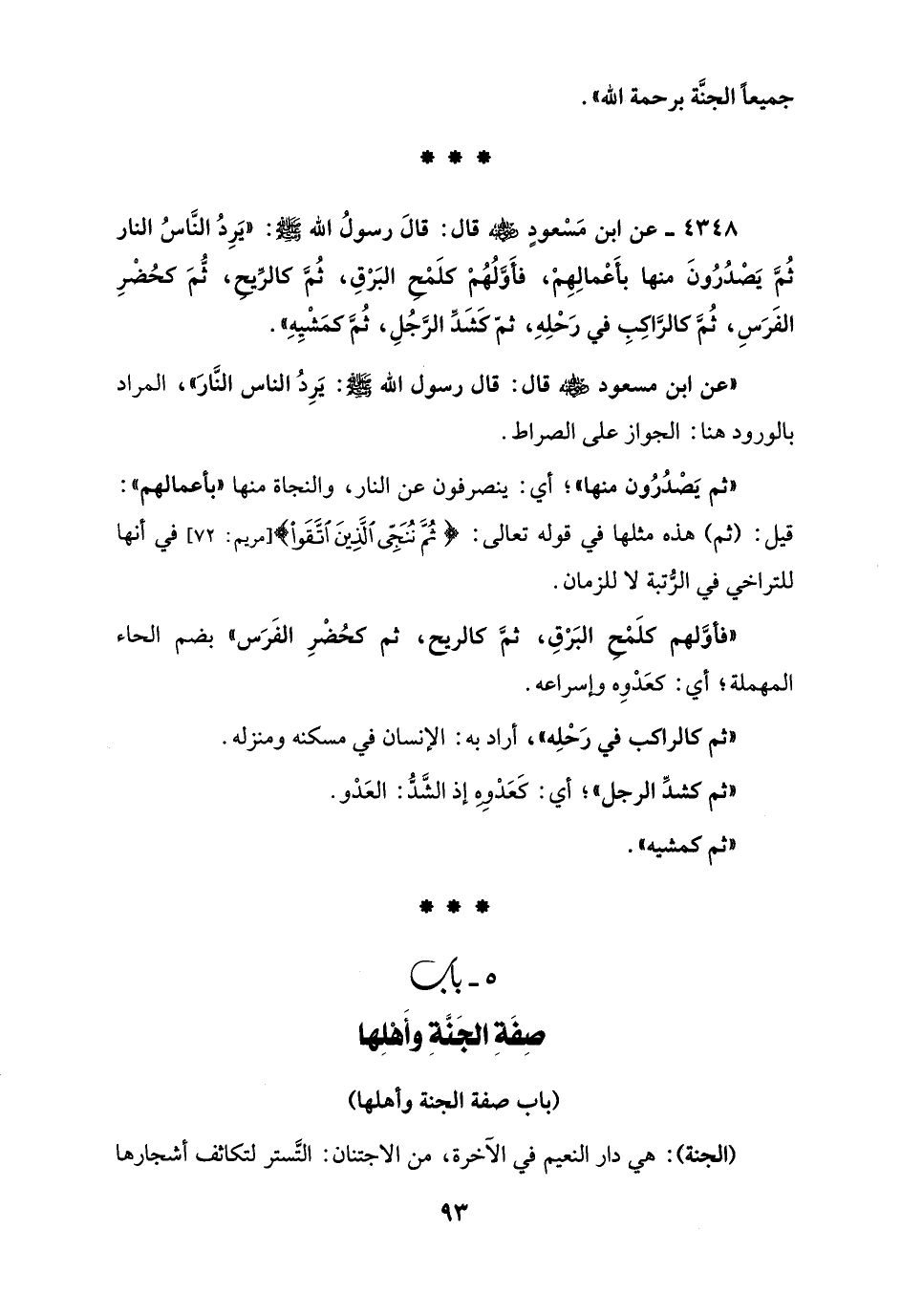 4348 - عن ابن مَسْعودٍ - رضي الله عنه - قال: قالَ رسولُ الله - صلى الله عليه وسلم -: " يَرِدُ النَّاسُ النار ثُمَّ يَصْدُرُونَ منها بأَعْمالِهِمْ، فَأَوَّلُهُمْ كلَمْحِ البَرْقِ، ثُمَّ كالرِّيحِ، ثُمَّ كحُضْرِ الفَرَسِ، ثُمَّ كالرَّاكِبِ في رَحْلِهِ، ثمّ كَشَدِّ الرَّجُلِ، ثُمَّ كمَشْيِهِ ".
