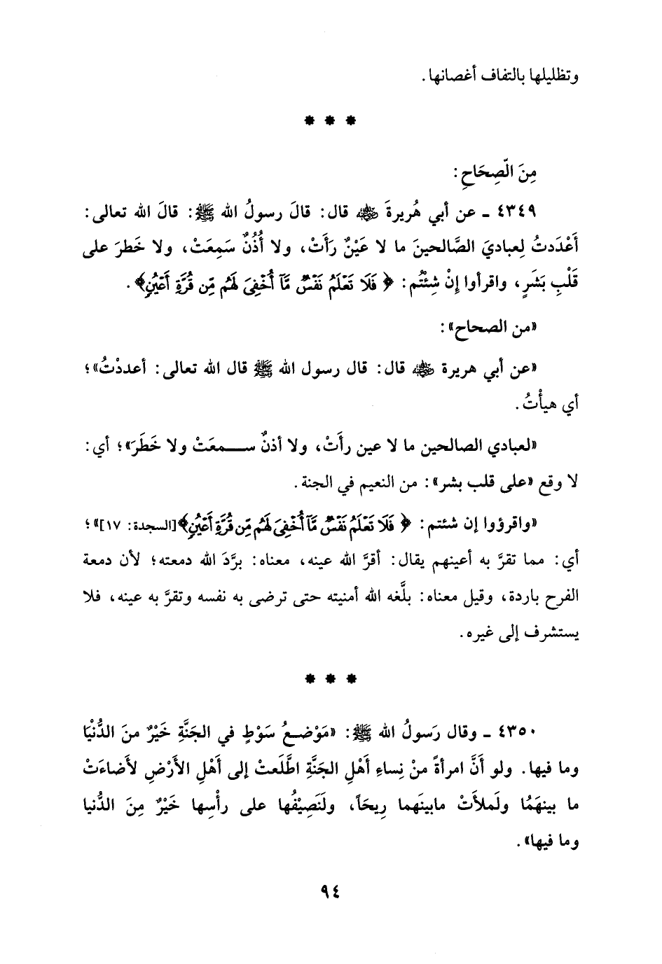 4349 - عن أبي هُريرةَ - رضي الله عنه - قال: قالَ رسولُ الله - صلى الله عليه وسلم -: قالَ الله تعالى: أَعْدَدتُ لِعباديَ الصَّالحينَ ما لا عَيْنٌ رَأَتْ، ولا أُذُنٌ سَمِعَتْ، ولا خَطرَ على قَلْبِ بَشَرٍ، واقرأوا إِنْ شِئتم: {فَلَا تَعْلَمُ نَفْسٌ مَا أُخْفِيَ لَهُمْ مِنْ قُرَّةِ أَعْيُنٍ جَزَاءً بِمَا كَانُوا يَعْمَلُونَ}.