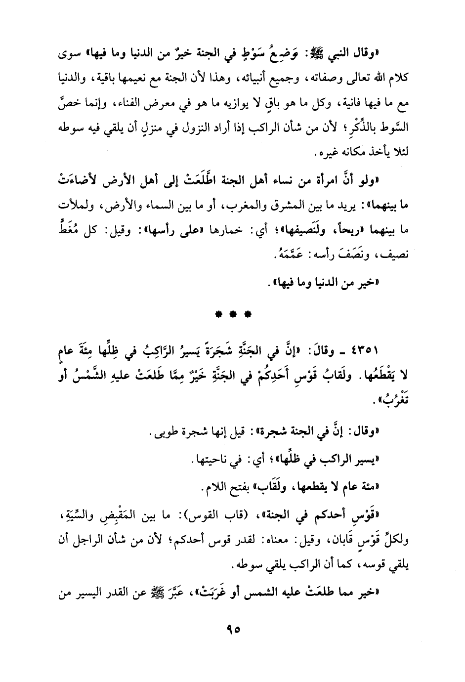 4351 - وقالَ: " إنَّ في الجَنَّةِ شَجَرَة يَسيرُ الرَّاكِبُ في ظِلِّها مِئَةَ عامٍ لا يَقْطَعُها. ولَقابُ قَوْسِ أَحَدِكُمْ في الجَنَّةِ خَيْرٌ مِمَّا طَلعَتْ عليهِ الشَّمْسُ أو تَغْرُبُ ".