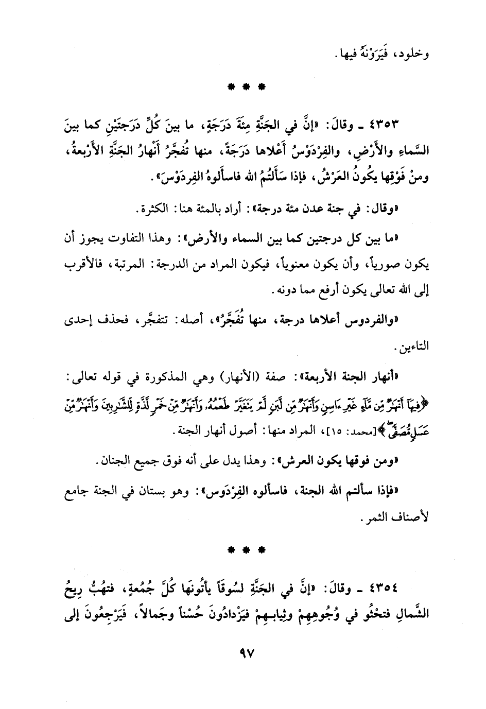 4353 - وقالَ: " إنَّ في الجَنَّةِ مِئَةَ دَرَجَةٍ، ما بينَ كُلِّ دَرَجتَيْنِ كما بينَ السَّماءَ والأَرْضِ، والفِرْدَوْسُ أَعْلاها دَرَجَةً، منها تُفجَّرُ أَنْهارُ الجَنَّةِ الأَرْبعةُ، ومنْ فَوْقها يكُونُ العَرْشُ، فإذا سَأَلتُمُ الله فاسألوهُ الفِردَوْسَ ".