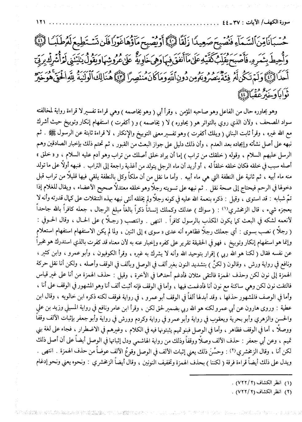 ( وَهُوَ يُحَاوِرُهُ ( حال من الفاعل وهو صاحبه المؤمن . وقرأ أبيّ وهو يخاصمه وهي قراءة تفسير لا قراءة رواية لمخالفته سواد المصحف ، ولأن الذي روي بالتواتر ) هُوَ يُحَاوِرُهُ ( لا يخاصمه . و ) أَكَفَرْتَ ( استفهام إنكار وتوبيخ حيث أشرك مع الله غيره . وقرأ ثابت البناني : ويلك ) أَكَفَرْتَ ( وهو تفسير معنى التوبيخ والإنكار لا قراءة ثابتة عن الرسول ( صلى الله عليه وسلم ) ) ، ثم نبهه على أصل نشأته وإيجاده بعد العدم وأن ذلك دليل على جواز البعث من القبور ، ثم تحتم ذلك بإخبار الصادقين وهم الرسل عليهم السلام . وقوله ) خَلَقَكَ مِن تُرَابٍ ( إما أن يراد خلق أصلك ) مّن تُرَابٍ ( وهو آدم عليه السلام وخلق أصله سبب في خلقه فكان خلقه خلقاً له ، أو أريد أن ماء الرجل يتولد من أغذية راجعة إلى التراب ، فنبهه أولاً على ما تولد منه ماء أبيه ثم ثانيه على النطفة التي هي ماء أبيه . وأما ما نقل من أن ملكاً وكلّ بالنطفة يلقى فيها قليلاً من تراب قبل دخولها في الرحم فيحتاج إلى صحة نقل .