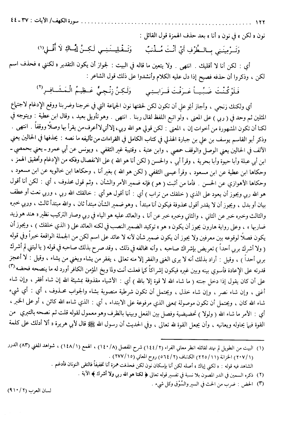 أي ولكنك زنجي ، وأجاز أبو علي أن تكون لكن لحقتها نون الجماعة التي في خرجنا وضربنا ووقع الإدغام لاجتماع المثلين ثم وحد في ) رَبّى ( على المعنى ، ولو اتبع اللفظ لقال ربنا انتهى . وهو تأويل بعيد . وقال ابن عطية : ويتوجه في لكنا أن تكون المشهورة من أخوات إن المعنى لكن قولي ) هُوَ اللَّهُ رَبّى ( إلاّ أني لا أعرف من يقرأ بها وصلاً ووقفاً انتهى . وذكر أبو القاسم يوسف بن عليّ ابن جبارة الهذلي في كتاب الكامل في القراءات من تأليفه ما نصه : يحذفها في الحالين يعني الألف في الحالين يعني الوصل والوقف حمصي وابن عتبة وقتيبة غير الثقفي ، ويونس عن أبي عمر ويعني بحمصي ابن أبي عبلة وأبا حيوة وأبا بحرية . قرأ أبيّ والحسن ) لَكِنِ ( أنا ) هُوَ اللَّهُ ( على الإنفصال ، وفكه من الإدغام وتحقيق الهمز ، وحكاها ابن عطية عن ابن مسعود . وقرأ عيسى الثقفي ) لَّكِنَّ هُوَ اللَّهُ ( بغير أنا ، وحكاها ابن خالويه عن ابن مسعود ، وحكاها الأهوازي عن الحسن . فأما من أثبت ) هُوَ ( فإنه ضمير الأمر والشأن ، وثم قول محذوف أي ) لَكِنِ ( أنا أقول ) هُوَ اللَّهُ رَبّى ( ويجوز أن يعود على الذي ) خَلَقَكَ مِن تُرَابٍ ( ، أي أما أقول : ) هُوَ ( أي خالقك ) اللَّهُ رَبّى ( و ) رَبّى ( نعت أو عطف بيان أو بدل ، ويجوز أن لا يقدر . أقول محذوفة فيكون أنا مبتدأ ، و ) هُوَ ( ضمير الشأن مبتدأ ثان و ) اللَّهِ ( مبتدأ ثالث ، و ) رَبّى ( خبره والثالث خبر عن الثاني ، والثاني وخبره خبر عن أنا ، والعائد عليه هو الياء في ) رَبّى ( ، وصار التركيب نظير هند هو زيد ضاربها . وعلى رواية هارون يجوز أن يكون هو توكيد الضمير النصب في لكنه العائد على الذي خلقك ، ويجوز أن يكون فصلاً لوقوعه بين معرفين ، ولا يجوز أن يكون ضمير شأن لأنه لا عائد على اسم لكن من الجملة الواقعة خبراً .