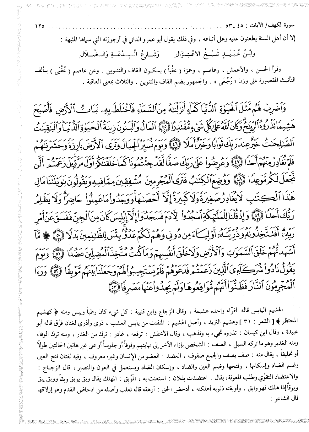 2 ( ) وَاضْرِبْ لَهُم مَّثَلَ الْحَيَواةِ الدُّنْيَا كَمَآءٍ أَنْزَلْنَاهُ مِنَ السَّمَاءِ فَاخْتَلَطَ بِهِ نَبَاتُ الاٌّ رْضِ فَأَصْبَحَ هَشِيمًا تَذْرُوهُ الرِّياحُ وَكَانَ اللَّهُ عَلَى كُلِّ شَىْءٍ مُّقْتَدِرًا الْمَالُ وَالْبَنُونَ زِينَةُ الْحَيَواةِ الدُّنْيَا وَالْبَاقِيَاتُ الصَّالِحَاتُ خَيْرٌ عِندَ رَبِّكَ ثَوَابًا وَخَيْرٌ أَمَلاً وَيَوْمَ نُسَيِّرُ الْجِبَالَ وَتَرَى الاٌّ رْضَ بَارِزَةً وَحَشَرْنَاهُمْ فَلَمْ نُغَادِرْ مِنْهُمْ أَحَداً وَعُرِضُواْ عَلَى رَبِّكَ صَفَا لَّقَدْ جِئْتُمُونَا كَمَا خَلَقْنَاكُمْ أَوَّلَ مَرَّةٍ بَلْ زَعَمْتُمْ أَلَّن نَّجْعَلَ لَكُمْ مَّوْعِدًا وَوُضِعَ الْكِتَابُ فَتَرَى الْمُجْرِمِينَ مُشْفِقِينَ مِمَّا فِيهِ وَيَقُولُونَ ياوَيْلَتَنَا مَا لِهَاذَا الْكِتَابِ لاَ يُغَادِرُ صَغِيرَةً وَلاَ كَبِيرَةً إِلاَّ أَحْصَاهَا وَوَجَدُواْ مَا عَمِلُواْ حَاضِرًا وَلاَ يَظْلِمُ رَبُّكَ أَحَدًا وَإِذَا قُلْنَا لِلْمَلَائِكَةِ اسْجُدُواْ لآِدَمَ فَسَجَدُواْ إِلاَّ إِبْلِيسَ كَانَ مِنَ الْجِنِّ فَفَسَقَ عَنْ أَمْرِ رَبِّهِ أَفَتَتَّخِذُونَهُ وَذُرِّيَّتَهُ أَوْلِيَآءَ مِن دُونِى وَهُمْ لَكُمْ عَدُوٌّ بِئْسَ لِلظَّالِمِينَ بَدَلاً مَّآ أَشْهَدتُّهُمْ خَلْقَ السَّمَاوَاتِ وَالاٌّ رْضِ وَلاَ خَلْقَ أَنفُسِهِمْ وَمَا كُنتُ مُتَّخِذَ الْمُضِلِّينَ عَضُداً وَيَوْمَ يَقُولُ نَادُواْ شُرَكَآئِىَ الَّذِينَ زَعَمْتُمْ فَدَعَوْهُمْ فَلَمْ يَسْتَجِيبُواْ لَهُمْ وَجَعَلْنَا بَيْنَهُم مَّوْبِقاً وَرَأَى الْمُجْرِمُونَ النَّارَ فَظَنُّواْ أَنَّهُمْ مُّوَاقِعُوهَا وَلَمْ يَجِدُواْ عَنْهَا مَصْرِفًا وَلَقَدْ صَرَّفْنَا فِى هَاذَا الْقُرْءَانِ لِلنَّاسِ مِن كُلِّ مَثَلٍ وَكَانَ الإِنْسَانُ أَكْثَرَ شَىءٍ جَدَلاً وَمَا مَنَعَ النَّاسَ أَن يُؤْمِنُواْ إِذْ جَآءَهُمُ الْهُدَى وَيَسْتَغْفِرُواْ رَبَّهُمْ إِلاَّ أَن تَأْتِيَهُمْ سُنَّةُ الاٌّ وَّلِينَ أَوْ يَأْتِيَهُمُ الْعَذَابُ قُبُلاً وَمَا نُرْسِلُ الْمُرْسَلِينَ إِلاَّ مُبَشِّرِينَ وَمُنذِرِينَ وَيُجَادِلُ الَّذِينَ كَفَرُواْ بِالْبَاطِلِ لِيُدْحِضُواْ بِهِ الْحَقَّ وَاتَّخَذُواْ ءايَاتِى وَمَا أُنْذِرُواْ هُزُواً وَمَنْ أَظْلَمُ مِمَّن ذُكِّرَ بِأايِاتِ رَبِّهِ فَأَعْرَضَ عَنْهَا وَنَسِىَ مَا قَدَّمَتْ يَدَاهُ إِنَّا جَعَلْنَا عَلَى قُلُوبِهِمْ أَكِنَّةً أَن يَفْقَهُوهُ وَفِىءَاذَانِهِمْ وَقْراً وَإِن تَدْعُهُمْ إِلَى الْهُدَى فَلَنْ يَهْتَدُواْ إِذاً أَبَداً وَرَبُّكَ الْغَفُورُ ذُو الرَّحْمَةِ لَوْ يُؤَاخِذُهُم بِمَا كَسَبُواْ لَعَجَّلَ لَهُمُ الْعَذَابَ بَل لَّهُم مَّوْعِدٌ لَّن يَجِدُواْ مِن دُونِهِ مَوْئِلاً وَتِلْكَ الْقُرَى أَهْلَكْنَاهُمْ لَمَّا ظَلَمُواْ وَجَعَلْنَا لِمَهْلِكِهِم مَّوْعِدًا ( ) ) 2