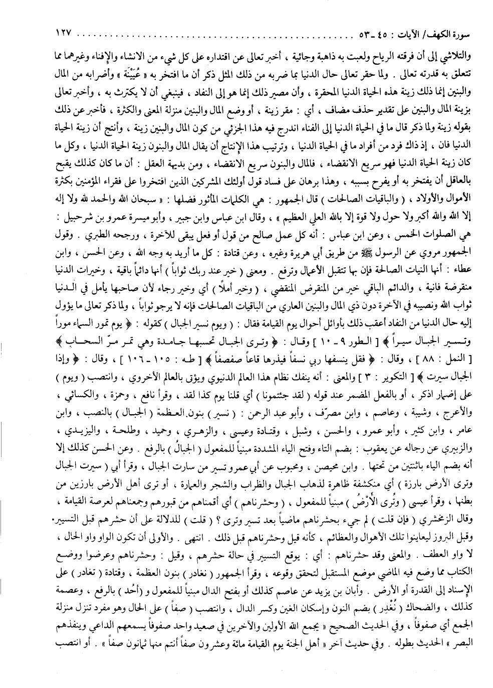 ( وَالْبَاقِيَاتُ الصَّالِحَاتُ ( قال الجمهور هي الكلمات المأثور فضلها سبحانه الله والحمد لله ولا إله إلاّ الله والله أكبر ، ولا حول ولا قوة إلاّ بالله العلي العظيم . وقال ابن عباس وابن جبير وأبو ميسرة عمرو بن شرحبيل هي الصلوات الخمس . وعن ابن عباس أنه كل عمل صالح من قول أو فعل يبقى للآخرة ، ورجحه الطبري وقول الجمهور مروي عن الرسول ( صلى الله عليه وسلم ) ) من طريق أبي هريرة وغيره . وعن قتادة : كل ما أريد به وجه الله . وعن الحسن وابن عطاء : أنا النيات الصالحة فإنّ بها تتقبل الأعمال وترفع ، ومعنى ) خَيْرٌ عِندَ رَبّكَ ثَوَابًا ( أنها دائمة باقية وخيرات الدنيا منقرضة فانية ، والدائم الباقي خير من المنقرض المنقضي . ) وَخَيْرٌ أَمَلاً ( أي وخير رجاء لأن صاحبها يأمل في الدنيا ثواب الله ونصيبه في الآخرة دون ذي المال والبنين العاري من الباقيات الصالحات فإنه لا يرجو ثواباً .