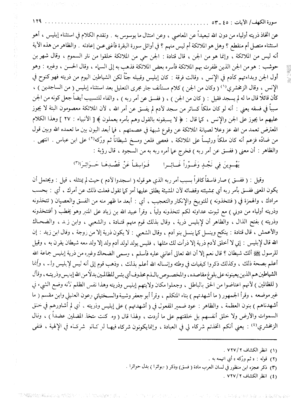 عن اتخاذ ذريته أولياء من دون الله تبعيداً عن المعاصي ، وعن امتثال ما يوسوس به . وتقدم الكلام في استثناء إبليس أهو استثناء متصل أم منقطع ، وهل هو من الملائكة أم ليس منهم في أوائل سورة البقرة فأغني عن إعادته ، والظاهر من هذه الآية أنه ليس من الملائكة وإنما هو من الجن . قال قتادة : الجن حي من الملائكة خلقوا من نار السموم . وقال شهر بن حوشب : هو من الجن الذين ظفرت بهم الملائكة فأسره بعض الملائكة فذهب به إلى السماء . وقال الحسن وغيره : هو أول الجن وبداءتهم كآدم في الإنس . وقالت فرقة : كان إبليس وقبيله جناً لكن الشياطين اليوم من ذريته فهو كنوح في الإنس . وقال الزمخشري : كان من الجن كلام مستأنف جارٍ مجري التعليل بعد استثناء إبليس من الساجدين كأن قائلاً قال : ما له لم يسجد فقيل ) كَانَ مِنَ الْجِنّ فَفَسَقَ عَنْ أَمْرِ رَبّهِ ( والفاء للتسبيب أيضاً جعل كونه من الجن سبباً في فسقه ، يعني إنه لو كان ملكاً كسائر من سجد لآدم لم يفسق عن أمر الله لأن الملائكة معصومون ألبتة لا يجوز عليهم ما يجوز على الجن والإنس كما قال : ) لاَ يَسْبِقُونَهُ بِالْقَوْلِ وَهُمْ بِأَمْرِهِ يَعْمَلُونَ ( وهذا الكلام المعترض تعمد من الله عز وعلا لصيانة الملائكة عن وقوع شبهة في عصمتهم ، فما أبعد البون بين ما تعمده الله وبين قول من ضادّه فزعم أنه كان ملكاً ورئيساً على الملائكة فعصي فلعن ومسخ شيطاناً ، ثم وكه على ابن عباس انتهى .