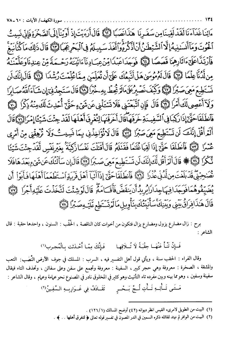 ءَاتِنَا غَدَآءَنَا لَقَدْ لَقِينَا مِن سَفَرِنَا هَاذَا نَصَباً قَالَ أَرَأَيْتَ إِذْ أَوَيْنَآ إِلَى الصَّخْرَةِ فَإِنِّى نَسِيتُ الْحُوتَ وَمَآ أَنْسَانِيهُ إِلاَّ الشَّيْطَانُ أَنْ أَذْكُرَهُ وَاتَّخَذَ سَبِيلَهُ فِى الْبَحْرِ عَجَبًا قَالَ ذَالِكَ مَا كُنَّا نَبْغِ فَارْتَدَّا عَلَىءَاثَارِهِمَا قَصَصًا فَوَجَدَا عَبْدًا مِّنْ عِبَادِنَآ ءَاتَيْنَاهُ رَحْمَةً مِّنْ عِندِنَا وَعَلَّمْنَاهُ مِن لَّدُنَّا عِلْمًا قَالَ لَهُ مُوسَى هَلْ أَتَّبِعُكَ عَلَى أَن تُعَلِّمَنِ مِمَّا عُلِّمْتَ رُشْداً قَالَ إِنَّكَ لَن تَسْتَطِيعَ مَعِىَ صَبْراً وَكَيْفَ تَصْبِرُ عَلَى مَا لَمْ تُحِطْ بِهِ خُبْراً قَالَ سَتَجِدُنِىإِن شَآءَ اللَّهُ صَابِرًا وَلاَ أَعْصِى لَكَ أمْراً قَالَ فَإِنِ اتَّبَعْتَنِى فَلاَ تَسْأَلْنى عَن شَىءٍ حَتَّى أُحْدِثَ لَكَ مِنْهُ ذِكْراً فَانْطَلَقَا حَتَّى إِذَا رَكِبَا فِى السَّفِينَةِ خَرَقَهَا قَالَ أَخَرَقْتَهَا لِتُغْرِقَ أَهْلَهَا لَقَدْ جِئْتَ شَيْئًا إِمْرًا قَالَ أَلَمْ أَقُلْ إِنَّكَ لَن تَسْتَطِيعَ مَعِىَ صَبْراً قَالَ لاَ تُؤَاخِذْنِى بِمَا نَسِيتُ وَلاَ تُرْهِقْنِى مِنْ أَمْرِى عُسْراً فَانْطَلَقَا حَتَّى إِذَا لَقِيَا غُلاَمًا فَقَتَلَهُ قَالَ أَقَتَلْتَ نَفْسًا زَكِيَّةً بِغَيْرِ نَفْسٍ لَّقَدْ جِئْتَ شَيْئاً نُّكْراً قَالَ أَلَمْ أَقُلْ لَّكَ إِنَّكَ لَن تَسْتَطِيعَ مَعِىَ صَبْراً قَالَ إِن سَأَلْتُكَ عَن شَىْءٍ بَعْدَهَا فَلاَ تُصَاحِبْنِى قَدْ بَلَغْتَ مِن لَّدُنِّى عُذْراً فَانطَلَقَا حَتَّى إِذَآ أَتَيَآ أَهْلَ قَرْيَةٍ اسْتَطْعَمَآ أَهْلَهَا فَأَبَوْاْ أَن يُضَيِّفُوهُمَا فَوَجَدَا فِيهَا جِدَاراً يُرِيدُ أَن يَنقَضَّ فَأَقَامَهُ قَالَ لَوْ شِئْتَ لاَتَّخَذْتَ عَلَيْهِ أَجْراً قَالَ هَاذَا فِرَاقُ بَيْنِى وَبَيْنِكَ سَأُنَبِّئُكَ بِتَأْوِيلِ مَا لَمْ تَسْتَطِع عَّلَيْهِ صَبْراً } )
