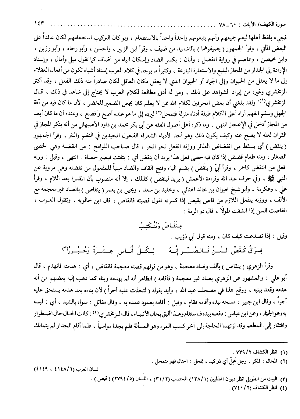 قال الزمخشري : ولقد بلغني أن بعض المحرفين لكلام الله ممن لا يعلم كان يجعل الضمير للخضر لأن ما كان فيه من آفة الجهل وسقم الفهم أراه أعلى الكلام طبقة أدناه منزلة ، فتمحل ليرده إلى ما هو عنده أصح وأفصح ، وعنده أن ما كان أبعد من المجاز أدخل في الإعجاز انتهى . وما ذكره أهل أصول الفقه عن أبي بكر محمد بن داود الأصبهاني من أنه ينكر المجاز في القرآن لعله لا يصح عنه ، وكيف يكون ذلك وهو أحد الأدباء الشعراء الفحول المجيدين في النظم والنثر .