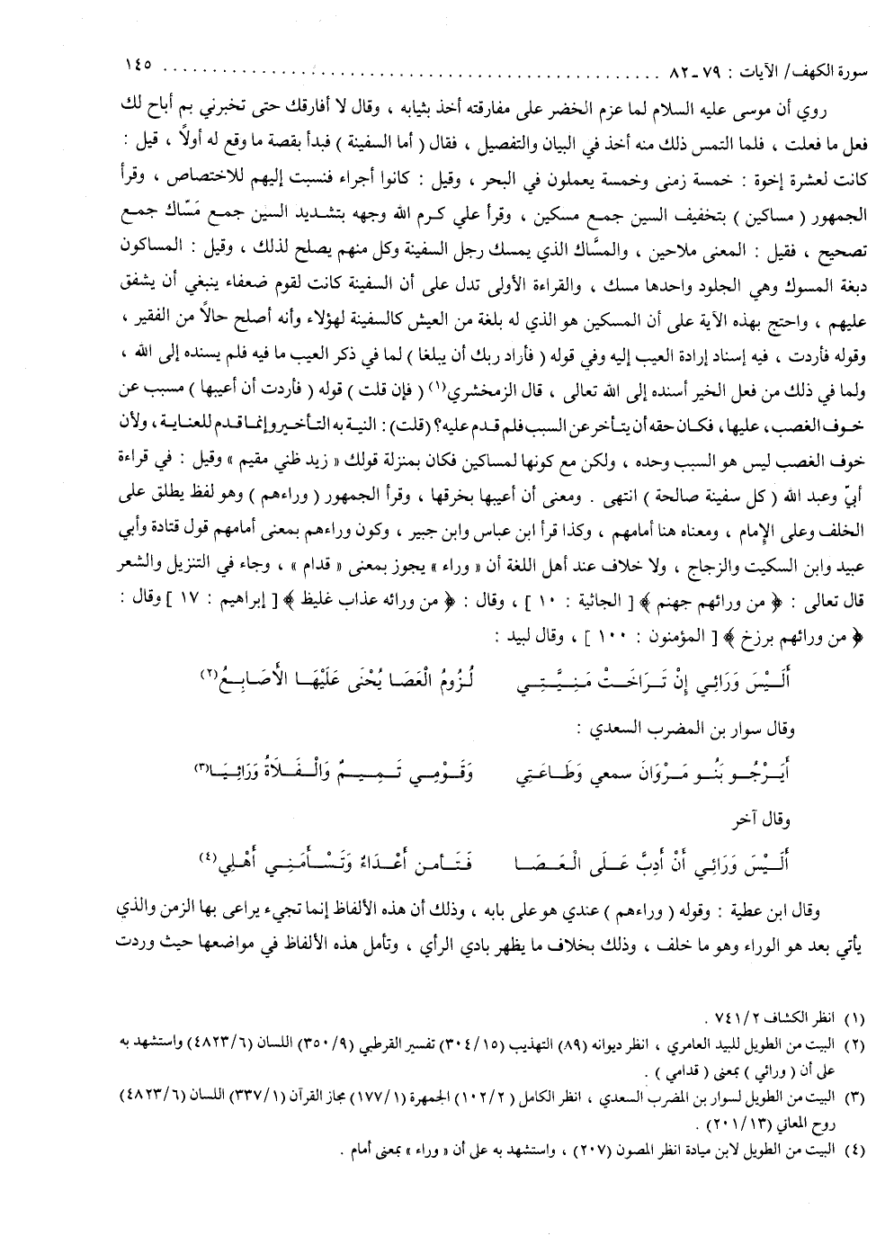 وقيل في قراءة أبيّ وعبد الله كل سفينة صالحة انتهى . ومعنى ) فَأَرَدتُّ أَنْ أَعِيبَهَا ( بخرقها . وقرأ الجمهور ) وَرَاءهُم ( وهو لفظ يطلق على الخلف وعلى الأمام ، ومعناه هنا أمامهم . وكذا قرأ ابن عباس وابن جبير . وكون ) وَرَاءهُم ( بمعنى أمامهم قول قتادة وأبي عبيد وابن السكيت والزجاج ، ولا خلاف عند أهل اللغة أن وراء يجوز بمعنى قدام ، وجاء في التزيل والشعر قال تعالى ) مِّن وَرَائِهِ جَهَنَّمُ ( وقال ) وَمِن وَرَائِهِ عَذَابٌ غَلِيظٌ ( وقال ) وَمِن وَرَائِهِمْ بَرْزَخٌ ). وقال لبيد : أليس ورائي إن تراخت منيتي