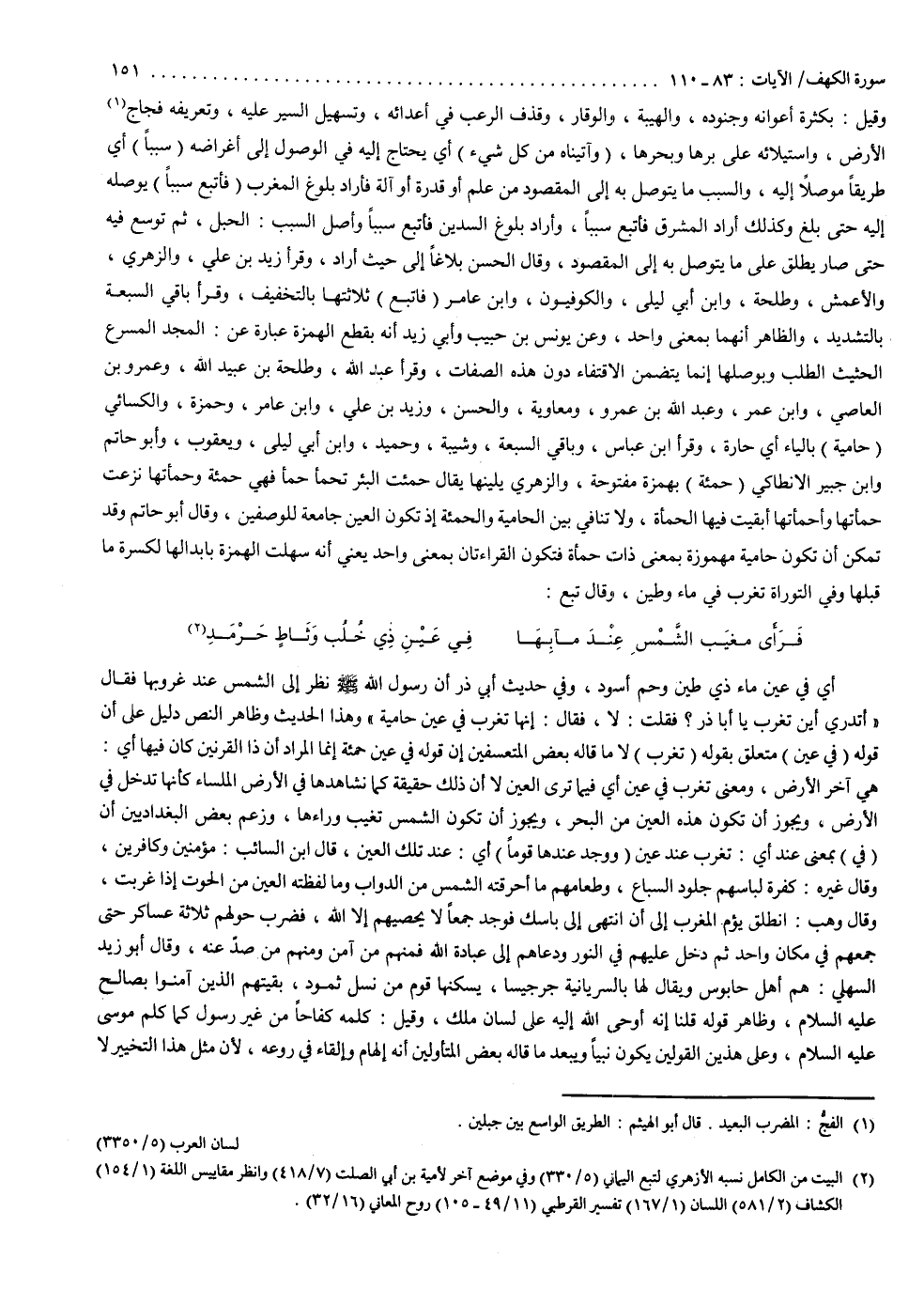 في عين ذي خلب وثاط حرمد أي في عين ماء ذي طين وحم أسود . وفي حديث أبي ذر أن رسول الله ( صلى الله عليه وسلم ) ) نظر إلى الشمس عند غروبها فقال : ( أتدري أين تغرب يا أبا ذر ؟ ) فقلت : لا . فقال : ( إنها تغرب في عين حامية ) . وهذا الحديث وظاهر النص دليل على أن قوله ) فِى عَيْنٍ ( متعلق بقوله ) تَغْرُبُ ( لا ما قاله بعض المتعسفين أن قوله في ) عَيْنٍ حَمِئَةٍ ( إنما المراد أن ذا القرنين كان فيها أي هي آخر الأرض ، ومعنى ) تَغْرُبُ فِى عَيْنٍ ( أي فيما ترى العين لا أن ذلك حقيقة كما نشاهدها في الأرض الملساء كأنها تدخل في الأرض ، ويجوز أن تكون هذه العين من البحر ، ويجوز أن تكون الشمس تغيب وراءها ، وزعم بعض البغداديين أن ) فِى ( بمعنى عند أي ) تَغْرُبُ ( عند عين .