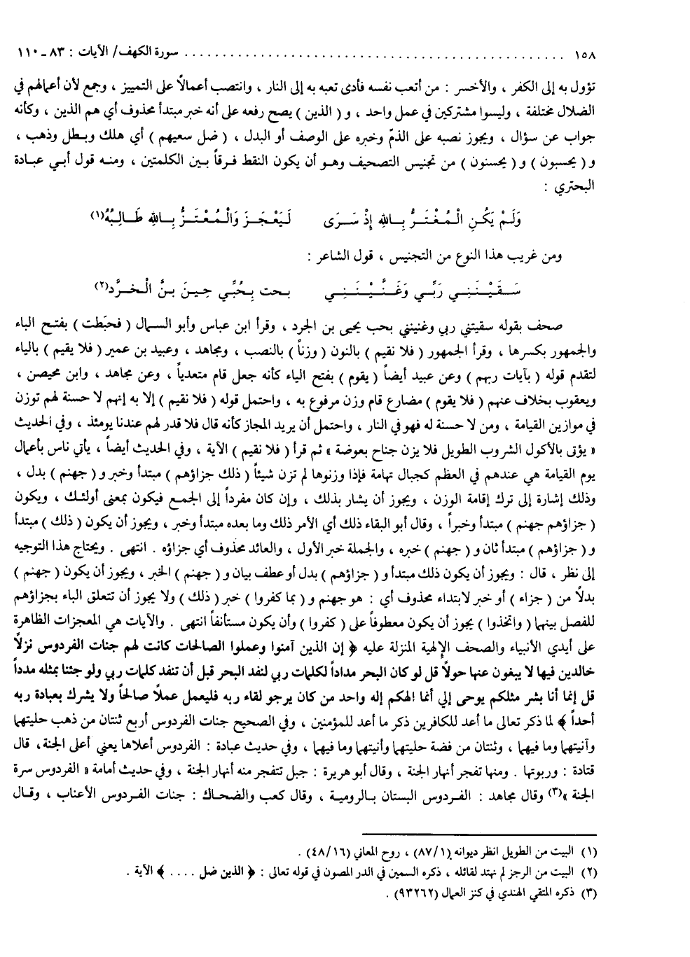 ( إِنَّ الَّذِينَ ءامَنُواْ وَعَمِلُواْ الصَّالِحَاتِ كَانَتْ لَهُمْ جَنَّاتُ الْفِرْدَوْسِ نُزُلاً خَالِدِينَ فِيهَا لاَ يَبْغُونَ عَنْهَا حِوَلاً قُل لَّوْ كَانَ الْبَحْرُ مِدَاداً لّكَلِمَاتِ رَبّى لَنَفِدَ الْبَحْرُ قَبْلَ أَن تَنفَدَ كَلِمَاتُ رَبّى وَلَوْ جِئْنَا بِمِثْلِهِ مَدَداً قُلْ إِنَّمَا أَنَاْ بَشَرٌ مّثْلُكُمْ يُوحَى إِلَىَّ أَنَّمَا إِلَاهُكُمْ إِلَاهٌ وَاحِدٌ فَمَن كَانَ يَرْجُو لِقَاء رَبّهِ فَلْيَعْمَلْ عَمَلاً صَالِحاً ).
