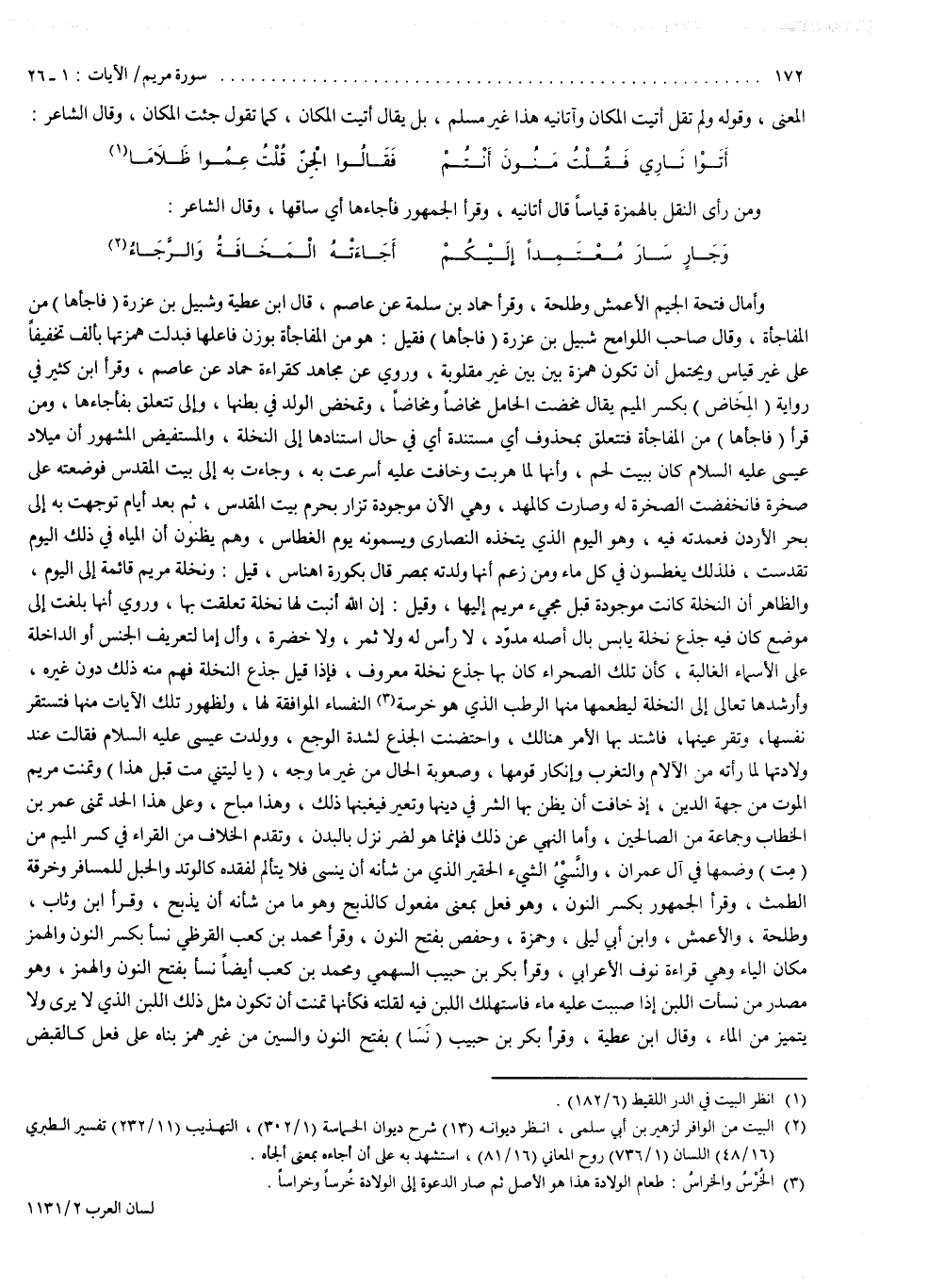 وأما فتحه الجيم الأعمش وطلحة . وقرأ حماد بن سلمة عن عاصم . قال ابن عطية وشبيل بن عزرة فاجأها من المفاجأة . وقال صاحب اللوامح شبيل بن عزرة : فاجأها . فقيل : هو من المفاجأة بوزن فاعلها فبدلت همزتها بألف تخفيف على غير قياس ، ويحتمل أن تكون همزة بين بين غير مقلوبة . وروي عن مجاهد كقراءة حماد عن عاصم . وقرأ ابن كثير في رواية ) الْمَخَاضُ ( بكسر الميم يقال مخضت الحامل مخاضاً ومخاضاً وتمخض الولد في بطنها : و ) إِلَى ( تتعلق بفأجاءها ، ومن قرأ فاجأها من المفاجأة فتتعلق بمحذوف أي مستندة أي فيحال استنادها إلى النخلة ، والمستفيض المشهور أن ميلاد عيسى عليه السلام كان بيت لحم ، وأنها لما هربت وخافت عليه أسرعت به وجاءت به إلى بيت المقدس فوضعته على صخرة فانخفضت الصخرة له وصارت كالمهد وهي الآن موجودة تزار بحرم بيت المقدس ، ثم بعد أيام توجهت به إلى بحر الأردن فعمدته فيه وهو اليوم الذي يتخذه النصارى ويسمونه يوم الغطاس وهم يظنون أن المياه في ذلك اليوم تقدست فلذلك يغطسون في كل ماء ، ومن زعم أنها ولدته بمصر قال : بكورة اهناس .